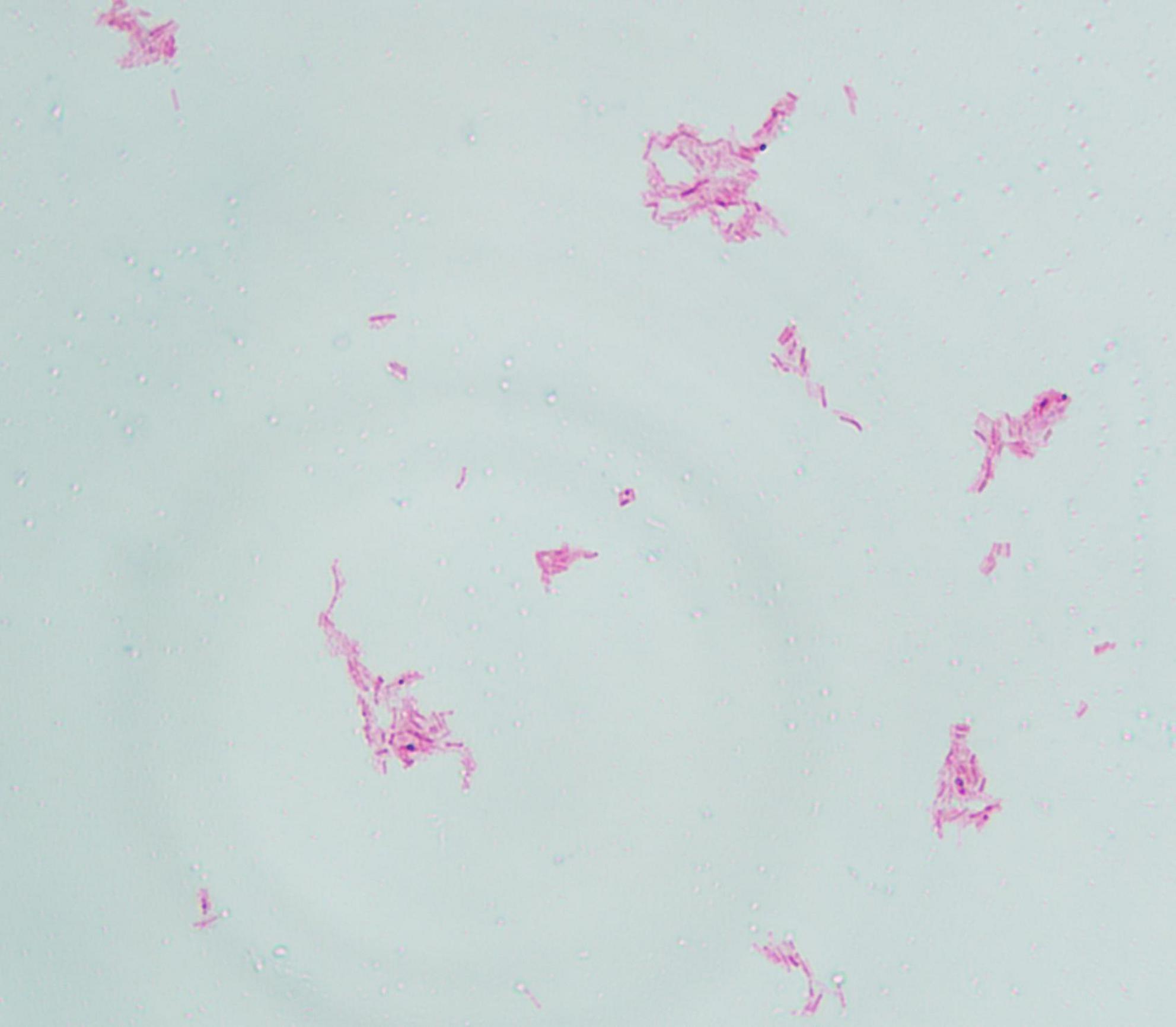 The pus material, obtained via needle puncture followed by extrusion, was inoculated onto chloramphenicol-containing Sabouraud Dextrose Agar (SDA) slants and PDA plates. To minimize contamination and moisture evaporation, the outer rim of each plate was sealed with laboratory tape. The inoculated media were then incubated at 25 °C. After 6 days of culture, PDA plates developed dense, white, raised granular colonies (Figure 3), whereas no growth was observed on SDA through day 14. Subcultured colonies were smeared onto slides for acid-fast staining, demonstrating numerous acid-fast bacilli (Figure 4). The isolate was identified as M. marinum by the matrix assisted laser desorption ionization time of flight mass spectrometry (MALDI-TOF MS) (Bruker Daltonik MALDI Biotyper) and the 16S ribosomal RNA (16S rRNA) sequencing (GenBank Accession No. PX128374). The mycological culture of nail debris samples confirmed the presence of Trichophyton rubrum. The patient was diagnosed with cutaneous NTM infection caused by M. marinum and treated with oral Doxycycline Hydrochloride Enteric-Coated Capsules (200 mg/d) for 6 months, resulting in complete resolution. No recurrence was reported during a 3-months telephone follow-up.