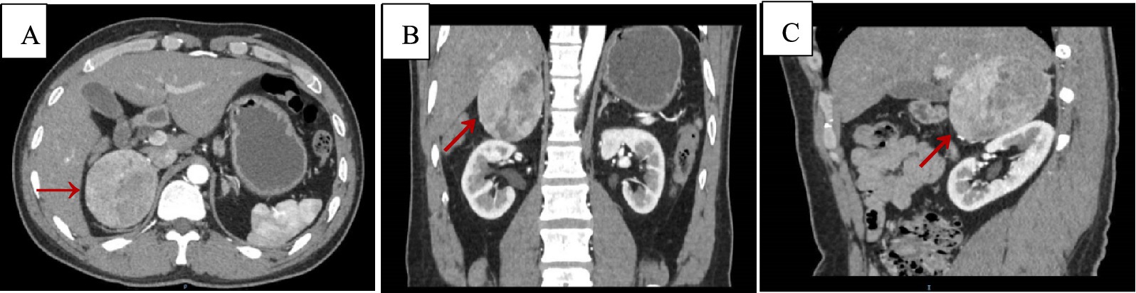 Figure 1. Adrenal CT + CTA scan, arterial phase images. Axial (A), coronal (B), and sagittal (C) views demonstrating a suprarenal mass measuring 6.6 cm × 5.2 cm × 7.0 cm, with a CT value of approximately 34 Hu (red arrows).