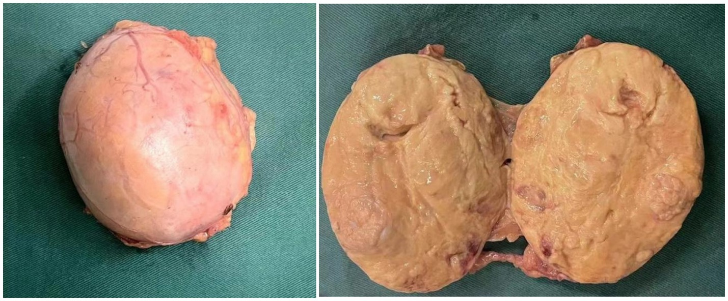 Figure 2. Postoperative specimen gross view: the surface capsule is smooth and intact, and the cut surface is grey-yellow solid.