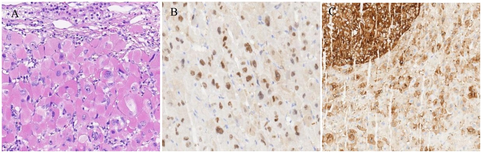 Figure 3. (A) Microscopic examination of the mass showed diffuse proliferation of polygonal cells with large irregular highly pleomorphic nuclei, prominent nucleoli, and abundant granular eosinophilic cytoplasm (HE, 400×). (B,C) Immunohistochemical staining of the resected adrenal tumor. (B) SF1 (+); (C) Syn (+).