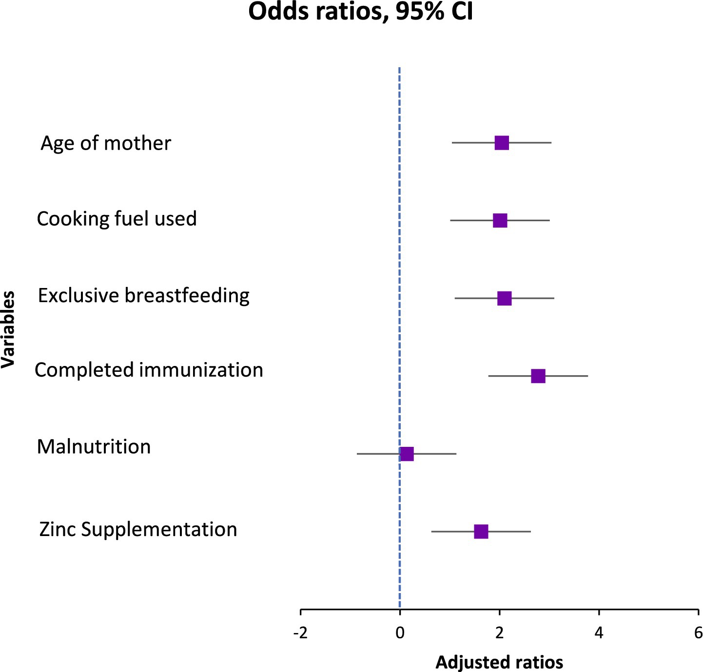 In regards to micronutrient supplementation, vitamin A did not present in a significant protective effect, in line with Orosz et al. (18), who found that the effects of vitamin A can be context-specific and the greatest in the case of severely deficient groups. On the other hand, zinc supplementation, though not statistically significant, showed an upward trend and is similar to the results of Luthi-Corridori et al. and Bakchi et al. (16, 17) who demonstrated the protective effect of zinc and suppression of respiratory tract inflammation. All of these trends point to a stronger correlation between pneumonia risk in this population and dietary and environmental factors that may be changed than with fundamental sociodemographic characteristics.