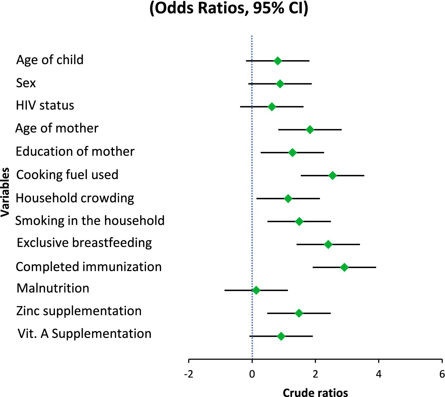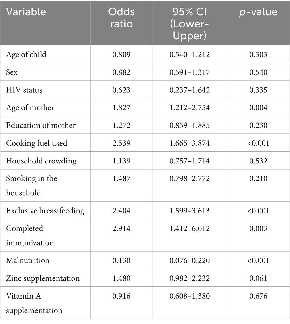 Results: Multivariable analysis identified significant risk factors: use of unclean cooking fuel (AOR = 2.01; 95% CI: 1.25–3.23), incomplete immunization (AOR = 2.78; 95% CI: 1.24–6.20), and lack of exclusive breastfeeding for 6 months (AOR = 2.10; 95% CI: 1.32–3.34). Maternal age ≥25 years was also associated with increased risk (AOR = 2.04; 95% CI: 1.26–3.31). Malnutrition showed an unexpected protective effect (AOR = 0.13; 95% CI: 0.08–0.23), while zinc supplementation showed a moderate effect (AOR = 1.63; 95% CI: 1.01–2.64). No significant associations were observed for HIV status, vitamin A supplementation, smoking exposure, child age, sex, or household crowding.