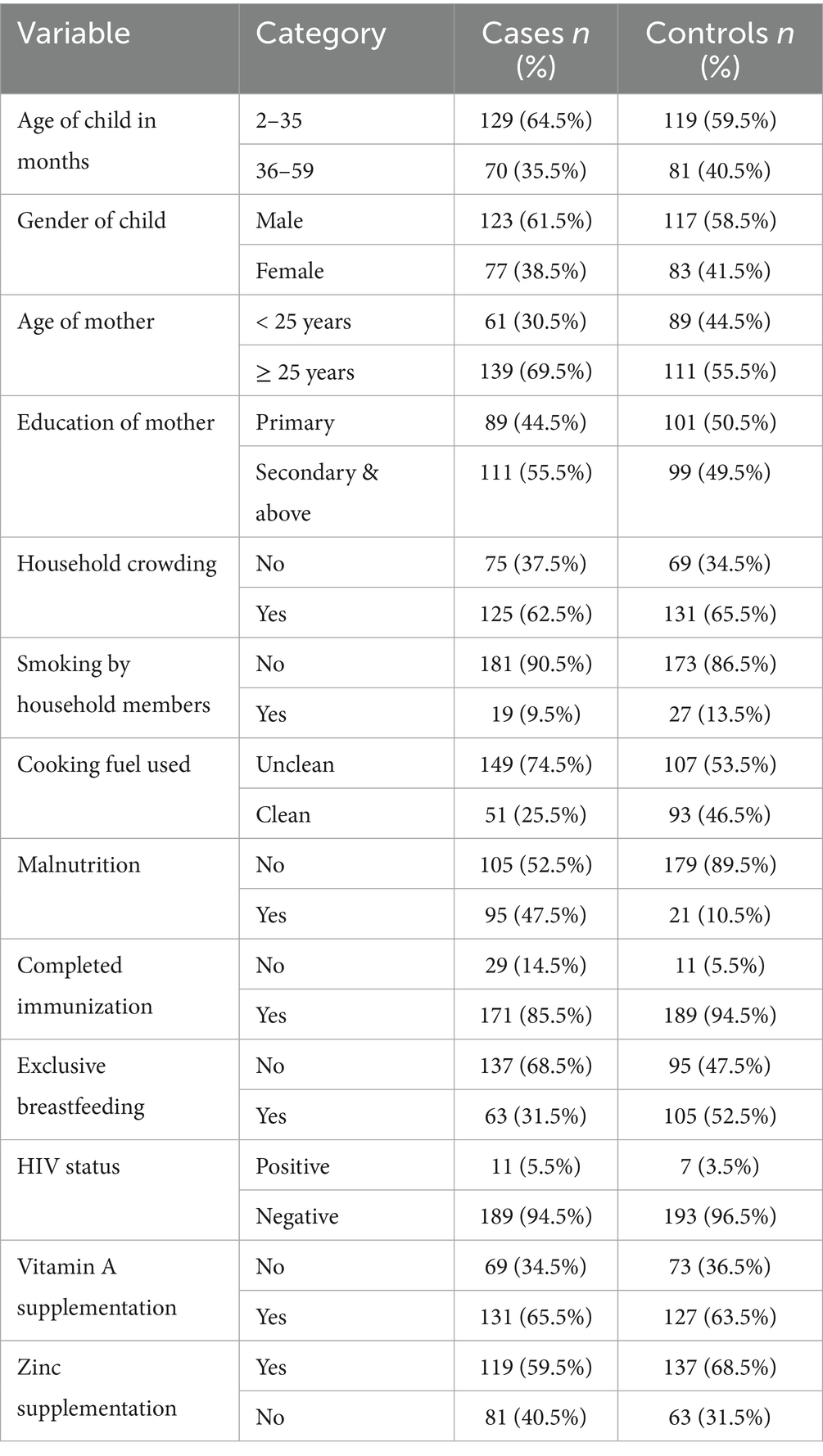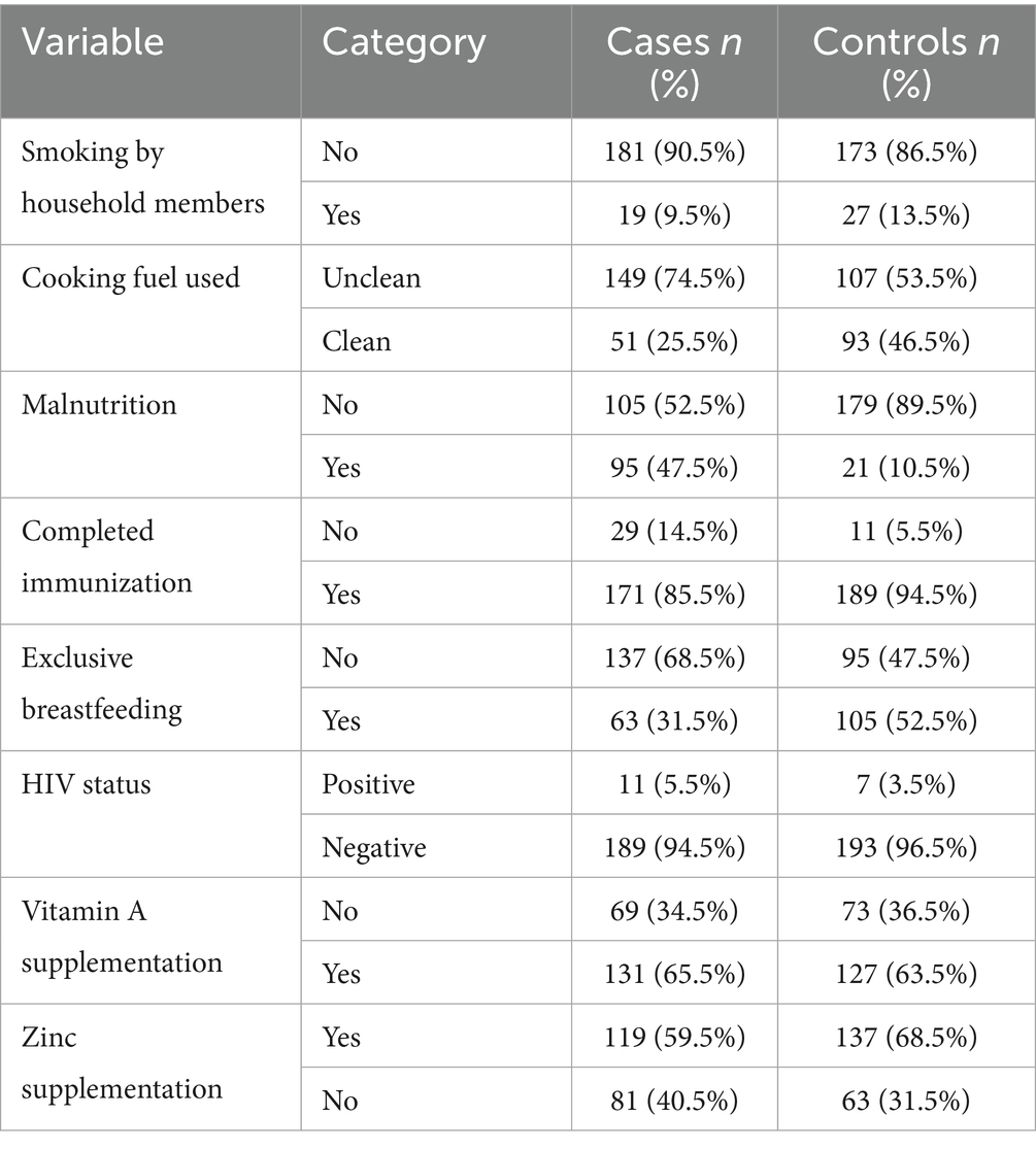 The study involved 400 children (2–59 months of age) who comprised 200 children with pneumonia and 200 children without respiratory diseases. Tables 1, 2 show the sociodemographic, environmental, and nutritional factors of the two groups.