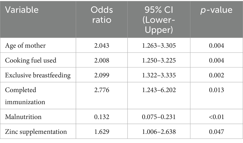 Another preventing factor was exclusive breastfeeding for the initial 6 months of birth. The preliminary analysis showed that the chances of pneumonia were nearly doubled if exclusive breastfeeding was not followed (OR = 2.40, 95% CI: 1.60–3.61, p < 0.001). The link persisted after adjusting for additional important factors (AOR = 2.10, 95% CI: 1.32–3.34, p = 0.002). These results are consistent with the known beneficial function of exclusive breastfeeding in lowering the probability of illness by promoting optimum dietary intake, developing passive defenses, and limiting the contact with tainted feeding methods (Table 4).