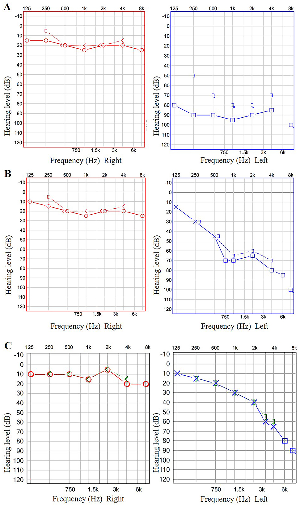 Figure 1. The patient's PTA results. The patient's PTA revealed severe sensorineural hearing loss across all frequencies in the left ear (A). After 8 and 13 days, follow-up PTA suggested significant improvement in hearing thresholds across all frequencies in the left ear (B, C).