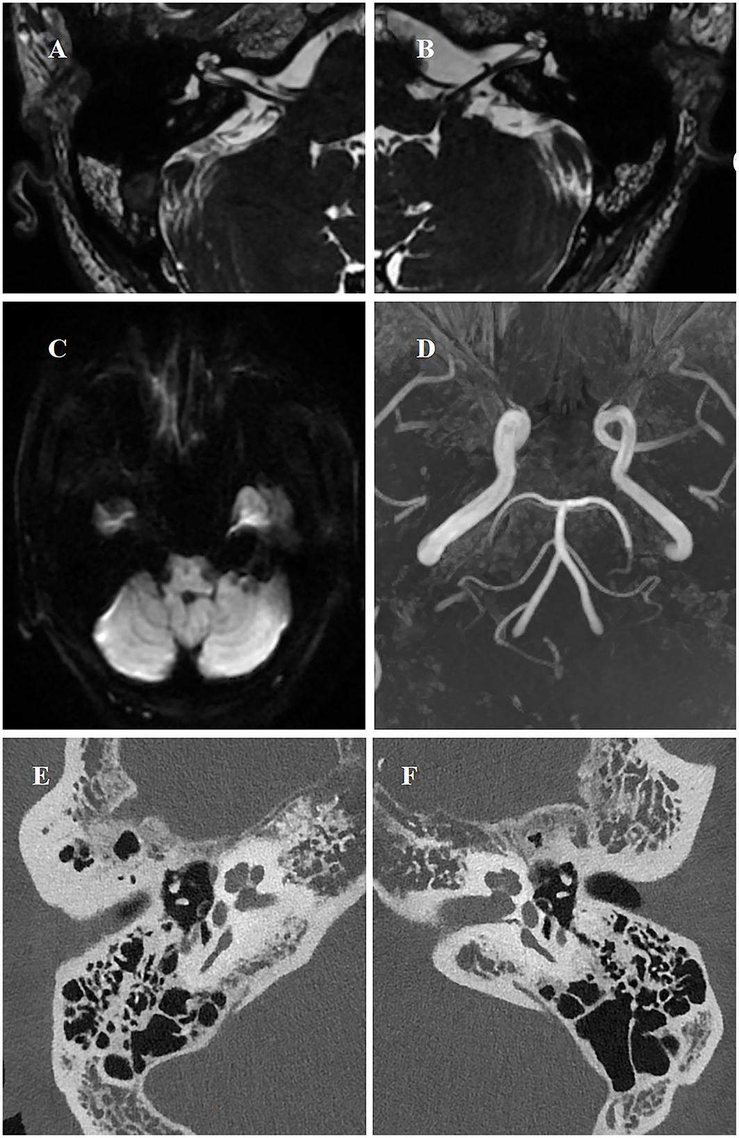 Figure 2. MRI, DWI, and PCCT at first presentation. Axial T2-weighted image (A, B) and DWI (C) showed no evidence of labyrinthine anomalies. MRI-3D TOF imaging showed no evidence of posterior circulation occlusion (D). The inner ear unenhanced PCCT revealed that the osseous labyrinth and surrounding structures exhibited no significant abnormalities in morphology or density (E, F).