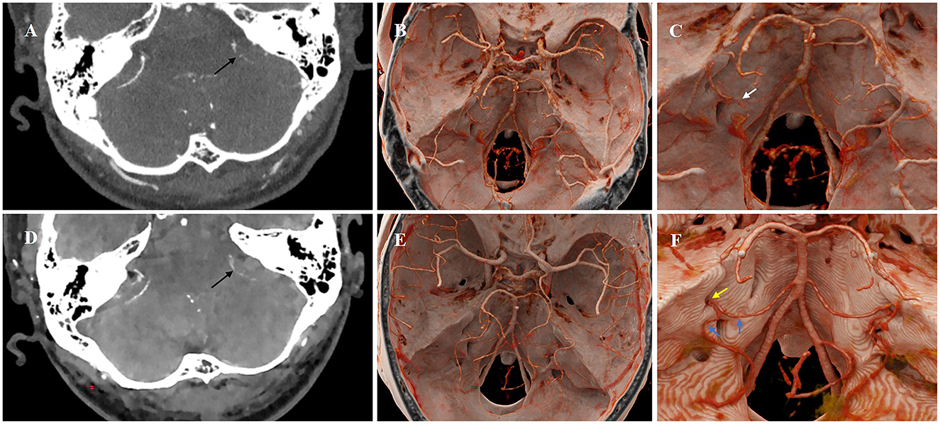 Figure 3. Pre- and post-treatment CTA with PCCT images of the inner ear. The inner ear CTA initially suggested that the left branches of AICA supplying the inner ear, including the labyrinthine artery, were slightly attenuated with sparse branching patterns (A). Furthermore, the luminal visualization of some branch arteries was incomplete (A, black arrow) (C, white arrow), and the distal segments of some branch vessels were not visualized, suggestive of stenosis or occlusion. Pre-treatment 3D-reconstructed images (B) showed inferior vascular delineation compared to post-treatment (E). After 12 days, the follow-up CTA revealed significant improvement in the caliber and blood flow of the branch arteries (D, black arrow). The 3D-reconstructed images (F) suggested that the left AICA and its branches still exhibited localized luminal stenosis (blue arrow), while the labyrinthine artery was already patent (yellow arrow).
