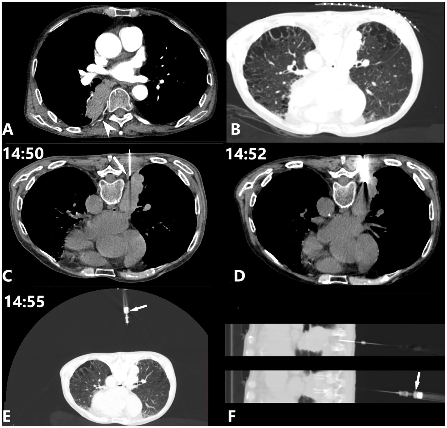 Figure 1. A 71-year-old male with a 10+ year history of recurrent cough and sputum production was admitted due to worsening symptoms and chest pain for 3 days. (A,B) Chest CT scan demonstrates emphysema with multiple bullae in both lungs, and an oval soft tissue density mass (approximately 3.0 × 6.0 cm) in the right lower lobe adjacent to the spine. An ICA (white arrowhead) courses along the posterior margin of the right lung mass. (C) To minimize the risk of pneumothorax, the puncture path was planned to avoid areas of emphysema and lung bullae. The coaxial puncture needle reaches the extrapleural pleura, with its medial edge adjacent to the origin segment of the ICA (white arrow). (D) Four tissue samples were obtained, each measuring 2.2 cm in length. (E,F) Bright red blood rapidly spurted into the 5 mL syringe (white arrow), with an approximate volume of 0.5 mL.