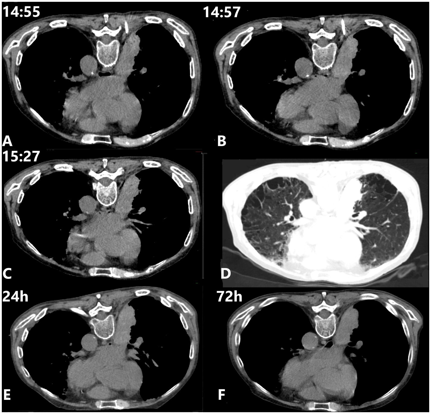 Figure 2. Intervention and evaluation. (A) Mechanical hemostasis was initiated. No visible hematoma or hemothorax was observed. The 5 mL syringe attached to the needle hub caused a slight tilt in the puncture needle. (B) No apparent signs of active bleeding were visible. (C,D) Following complete needle withdrawal, no apparent signs of active bleeding or pneumothorax were observed. (E,F) Follow-up CT scan images obtained at 24 and 72 h post-procedure.