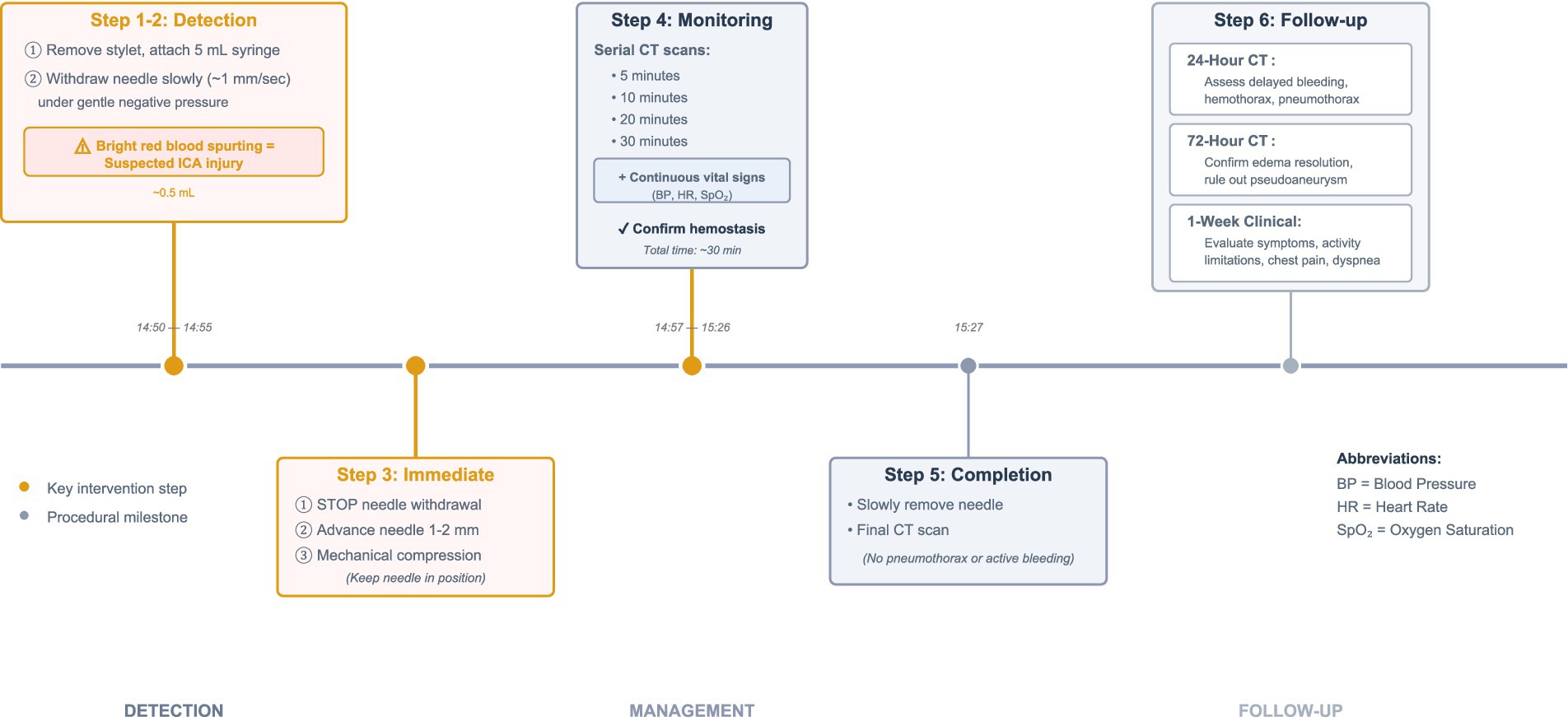 Throughout the procedure, vital signs remained stable, and the patient reported no discomfort. CT scans performed during the hemostasis process revealed slight edema and thickening of the soft tissue surrounding the injured ICA compared to the contralateral side, with no progressive worsening or signs of active bleeding. Follow-up CT scans at 24 and 72 h post-procedure showed no evidence of pneumothorax or new hemorrhage, with gradual resolution of mild local soft tissue edema (Figures 2E,F). The procedural timeline and management sequence are summarized in Figure 3.