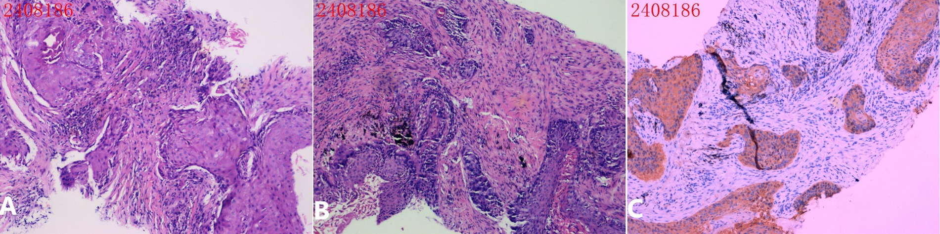 Pathological examination confirmed well-differentiated squamous cell carcinoma (Figure 4). The patient subsequently initiated appropriate treatment. During the week-long follow-up period, the patient reported no biopsy-related pain, activity limitations, or complications.