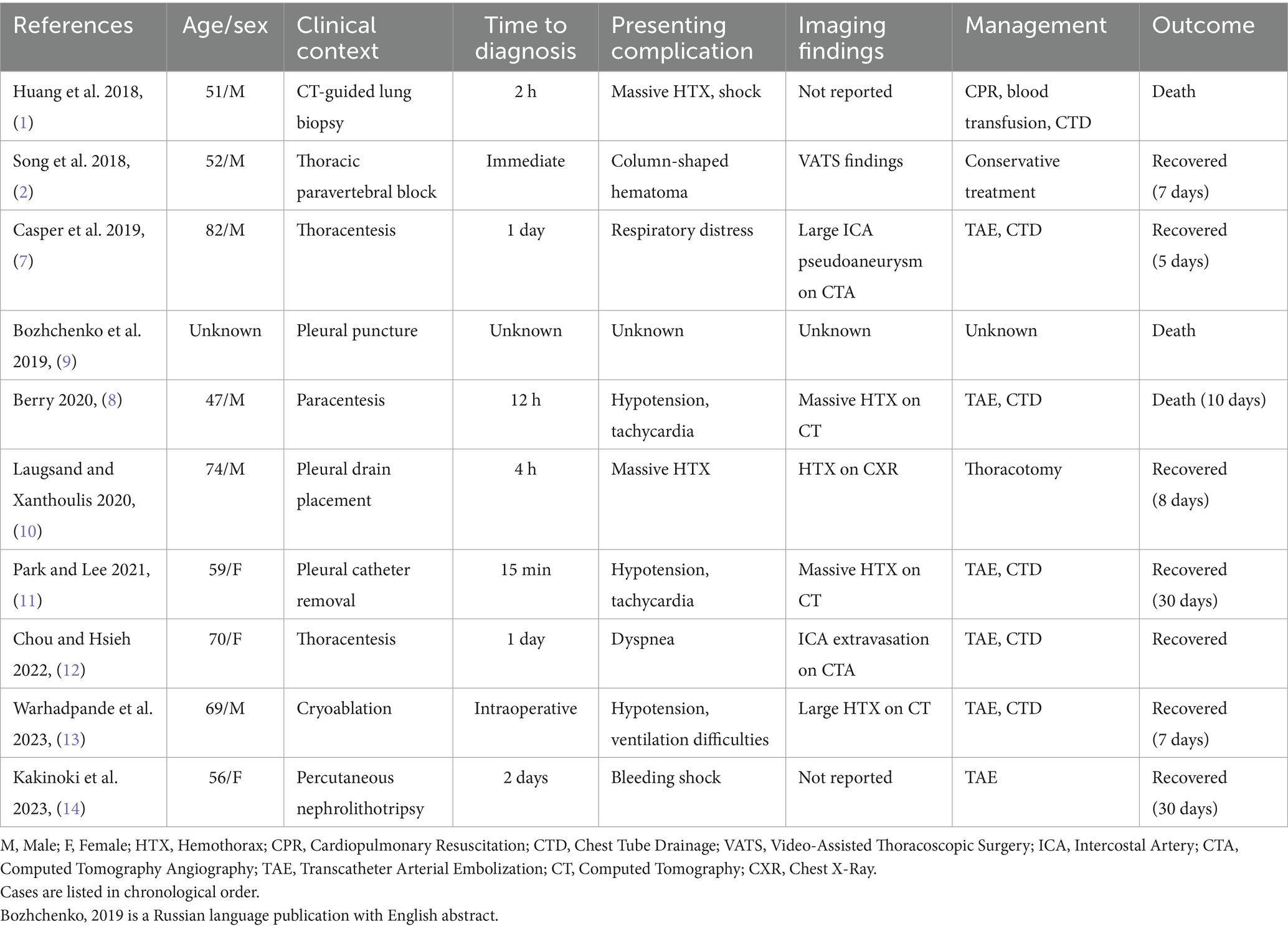 A systematic review of literature from 2018 to 2024 was conducted using PubMed database. Search terms included “intercostal artery injury,” “intercostal artery pseudoaneurysm,” and “hemothorax biopsy lung.” Studies reporting iatrogenic ICA injuries in thoracoabdominal procedures and hemothorax complications in PTNB were included.