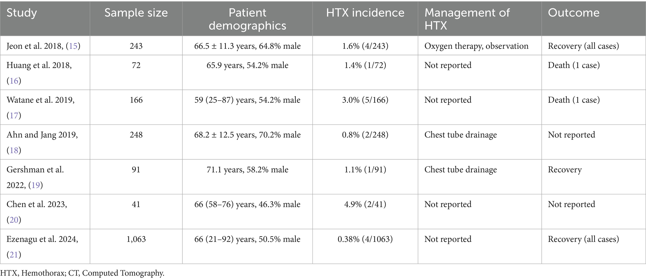 Table 2. Incidence and management of hemothorax in CT-guided PTNB: a review of original research (2018–2024) (15–21).