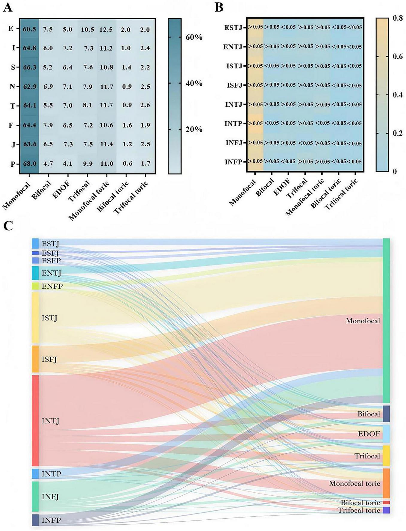 Distribution of IOL selection across MBTI types. (A) Heatmaps illustrating specific percentages of IOL types selected across eight MBTI dimensions. (B) Heatmaps showing proportional differences in IOL selection patterns among the eight major MBTI personality subgroups. (C) Sankey diagram demonstrating the relationships between eleven MBTI personality profiles and the seven IOL types. The thickness of each pathway represents the relative proportion of surgeons selecting a given IOL type. Monofocal IOLs were most frequently selected across personality subtypes, followed by monofocal toric IOLs.
