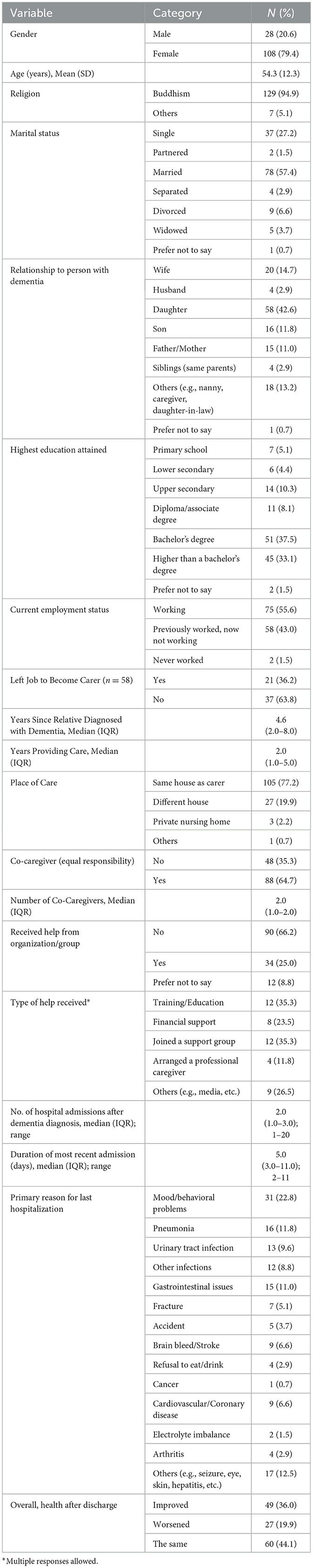 A total of 136 family carers participated in this study. This section presents their sociodemographic backgrounds and caregiving profiles, which help contextualize their experiences and perspectives regarding dementia care. Table 1 summarizes the demographic and caregiving characteristics of 136 family carers of persons with dementia. Most carers were female (79.4%) with a mean age of 54.3 years, predominantly Buddhist, and over half were married. The majority were daughters (42.6%) or wives (14.7%) of the patients. Nearly three-quarters had at least a bachelor's degree. The median duration of caregiving was 2 years, with most providing care in the same household. About two-thirds shared caregiving responsibilities with others, but only a quarter received external organizational support. The most common reasons for hospitalization of persons with dementia were mood or behavioral symptoms, infections, and gastrointestinal issues. Following discharge, the perceived health outcomes of persons with dementia were reported as unchanged (44.1%), improved (36.0%), or worsened (19.9%) by carers.