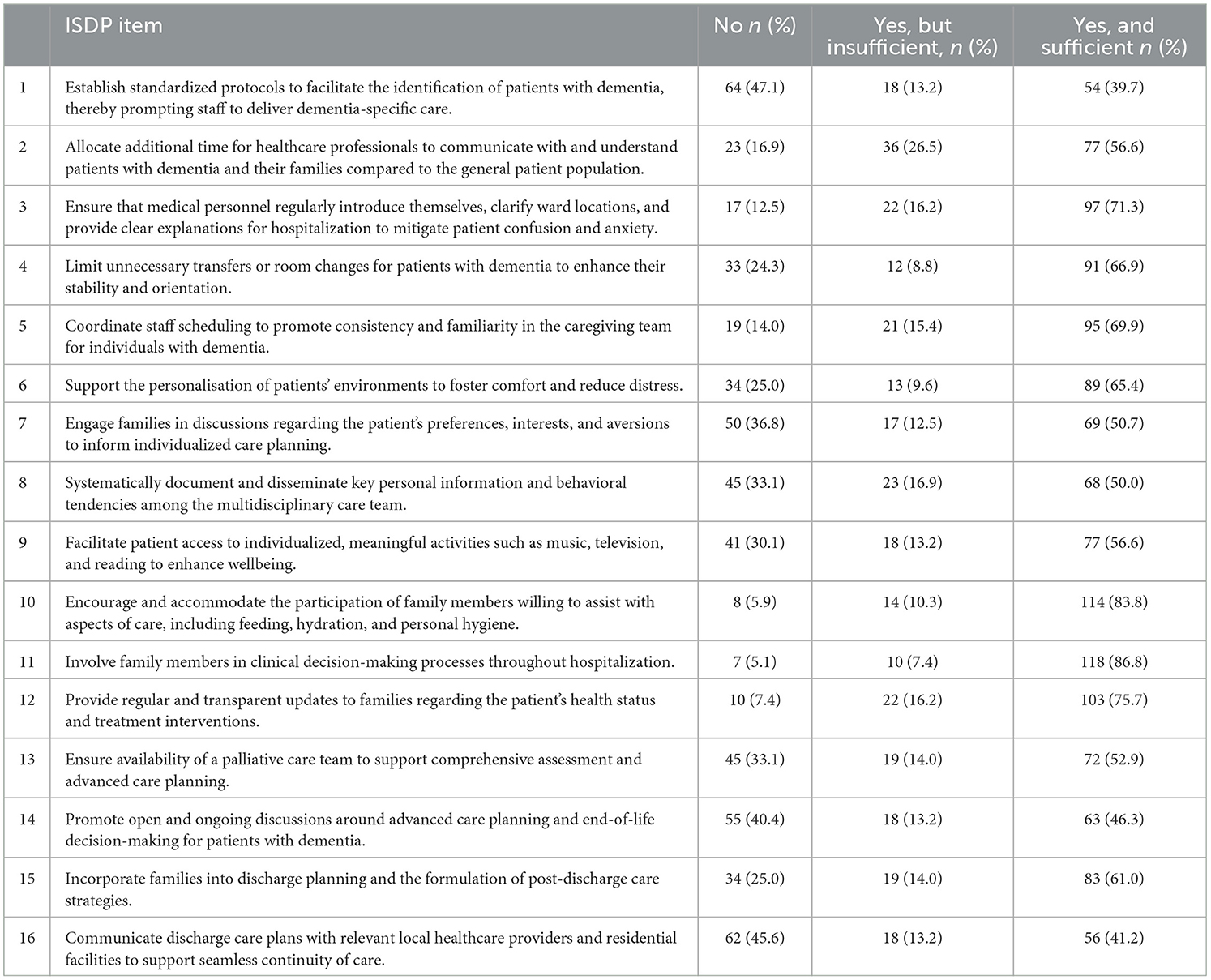 • Implementation and Sufficiency of Dementia-Friendly Practices (ISDP). Hospital care processes were evaluated using a self-developed questionnaire entitled “Implementation and Sufficiency of Dementia-Friendly Practices.” This structured tool was developed based on current international guidelines and expert consensus for dementia care in acute settings. It includes 16 items assessing both the presence and perceived adequacy of key dementia-friendly practices across several domains, such as dementia identification, family involvement, communication, environmental personalization, and care planning. For each item, respondents indicated whether the practice was implemented as “No,” “Yes, but insufficient,” or “Yes, and sufficient.” Higher scores represent greater implementation and sufficiency of dementia-friendly approaches. The ISDP tool demonstrated acceptable internal consistency with a Cronbach's alpha of 0.88 in this study.