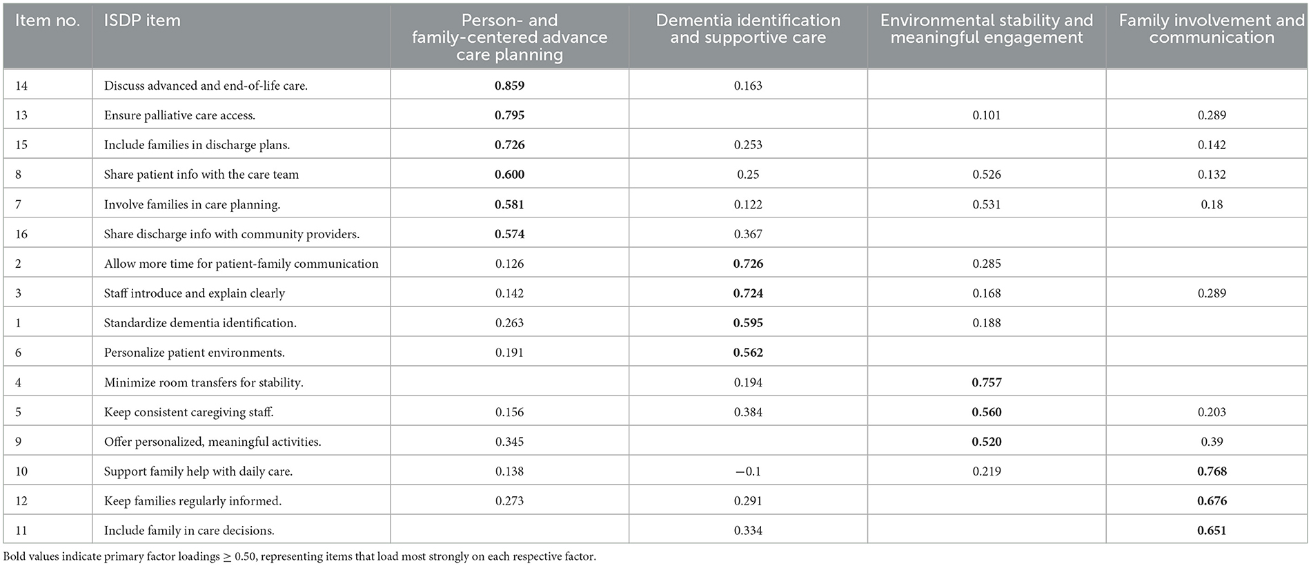 To explore the underlying construct validity of the ISDP questionnaire, we conducted a principal component analysis (PCA) with varimax rotation using all 16 ISDP items. This statistical approach allowed identification of item groupings representing key domains of dementia-friendly hospital practice as perceived by carers. Table 3 presents the factor structure of the ‘Implementation and Sufficiency of Dementia-Friendly Practices' (ISDP) questionnaire, as determined by principal component analysis (PCA) of its 16 items. This table demonstrates how specific ISDP items loaded onto four distinct factors following varimax rotation. Four main factors were identified: (1) Person- and Family-Centered Advance Care Planning; (2) Dementia Identification and Supportive Care; (3) Environmental Stability and Meaningful Engagement; and (4) Family Involvement and Communication. The pattern of factor loadings is shown below.