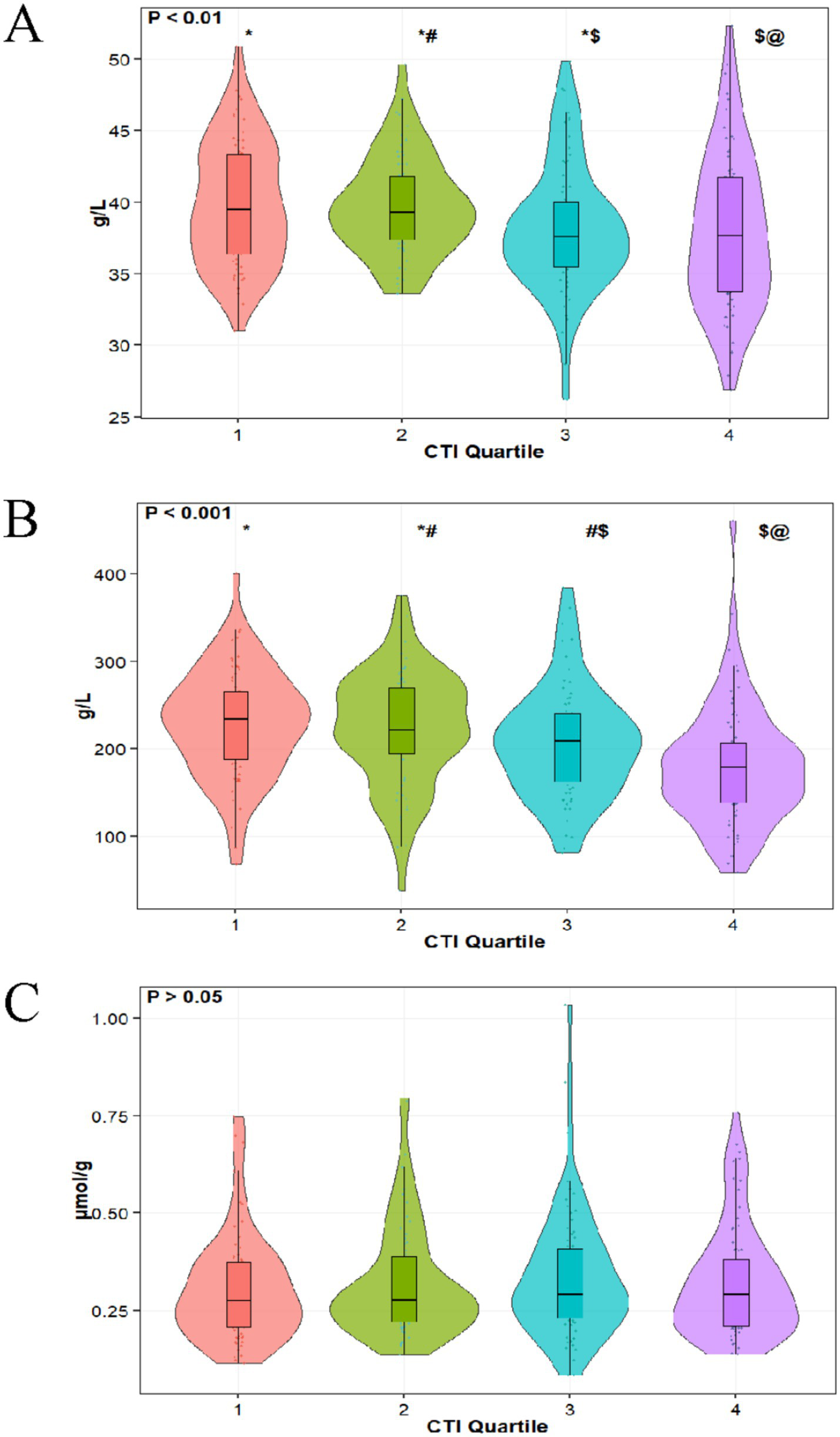 Distribution of ALB (A), PA (B), and TBIL/ALB (C) in different CTI quartiles.