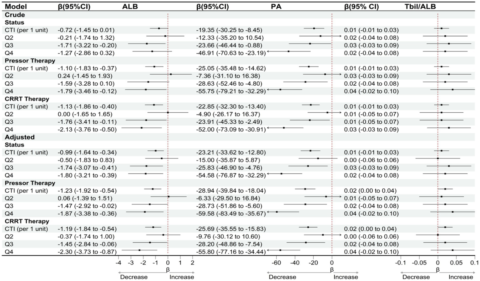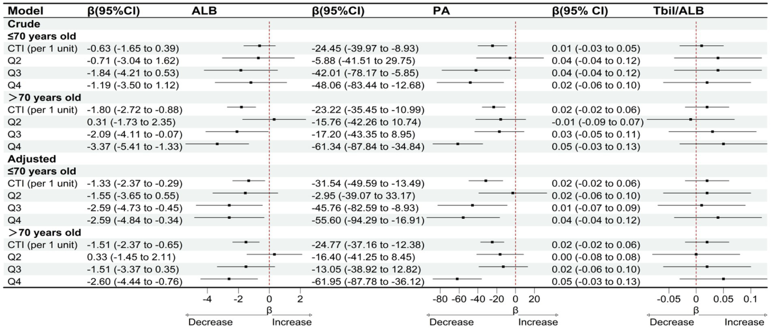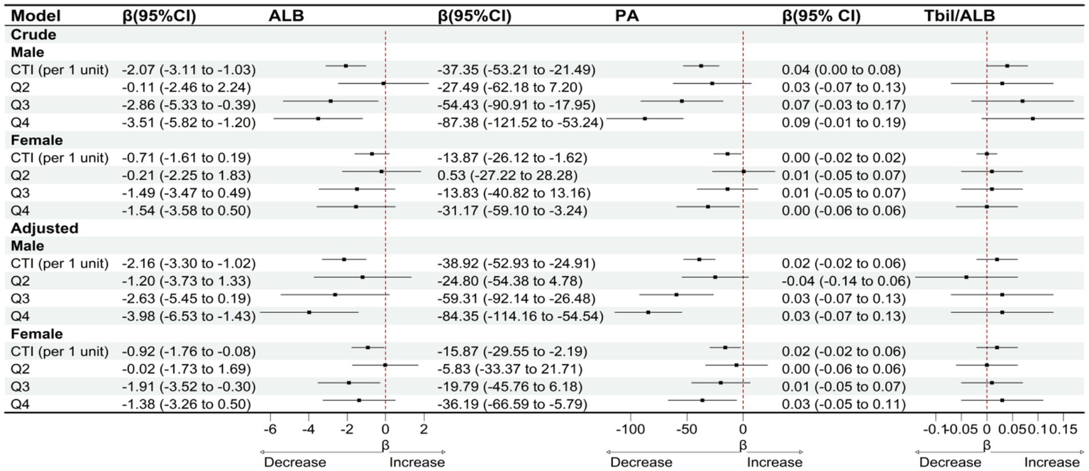Higher CTI was independently associated with lower ALB (β per unit CTI = −1.23 g/L, p < 0.001) and PA (β = −26.35 mg/L, p < 0.001), but not with TBIL/ALB (β = 0.02, p = 0.135). Compared with Q1, Q4 had lower ALB (−2.19 g/L, p = 0.002) and PA (−56.05 mg/L, p < 0.001), with linear dose–response supported by splines (ALB p-overall <0.001; PA p-overall <0.001; nonlinearity p > 0.30). Adding CTI improved discrimination for ALB and PA, but not for TBIL/ALB. Effects were larger in males (per-unit: ALB −2.16 g/L; PA −38.92 mg/L) than females (ALB −0.92 g/L; PA −15.87 mg/L). Sensitivity analyses excluding deaths, pressor users, or CRRT yielded consistent estimates.