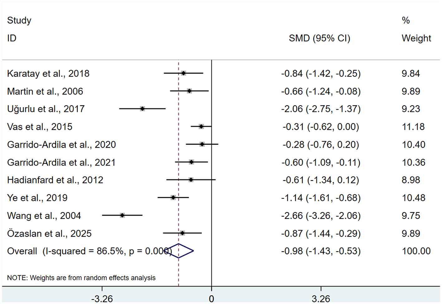 A total of 10 studies (13–15, 17–19, 23, 26–28), involving 689 patients. Heterogeneity testing revealed I2 = 86.5%, indicating the presence of heterogeneity, and a REM was used for analysis. Results of the meta-analysis indicated that FMS patients receiving acupuncture exhibited significantly lower FIQ than control group (SMD: −0.98; 95% CI: −1.43, −0.53), τ2 = 0.4444, with statistical significance (P < 0.05; Figure 4).