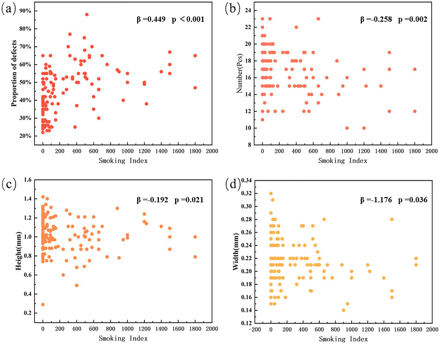 Smoking index and distribution of morphological parameters of meibomian gland. (a) Proportion of gland defects (β = 0.449, p < 0.001). (b) Number of meibomian glands (β = −0.258, p = 0.002). (c) Gland height (β = −0.192, p = 0.021). (d) Gland width (β = −1.176, p = 0.036).