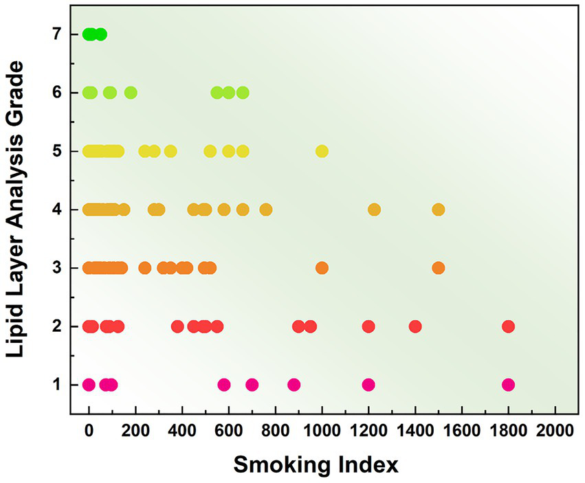 Non-smoking subjects exhibited lipid layer grades predominantly ranging from Grade 3 to Grade 6. The majority showed smooth meibum diffusion with abundant meibum secretion. In contrast, smokers generally had lower meibum diffusion grades, which were concentrated between Grade 2 and Grade 6. Specifically, the mild smoking group primarily displayed grades between 3 and 5, the moderate group between 2 and 5, and the heavy smoking group between 1 and 4. The distribution of average meibum layer grades across the four groups is presented in Figure 6. Ordered logistic regression analysis was conducted to evaluate the dose–response relationship between smoking index and ordinal meibum diffusion grade scores. Smoking index was identified as a significant predictor for deterioration in meibum diffusion grading (B = −0.002, OR = 0.998, 95% CI: −0.001 to −0.002, p < 0.001). In contrast, the association between gender and meibum grade showed no statistical significance (p = 0.810). These results confirm that smoking significantly impairs the secretory function of meibomian glands, leading to reduced quantity and quality of meibum secretion.