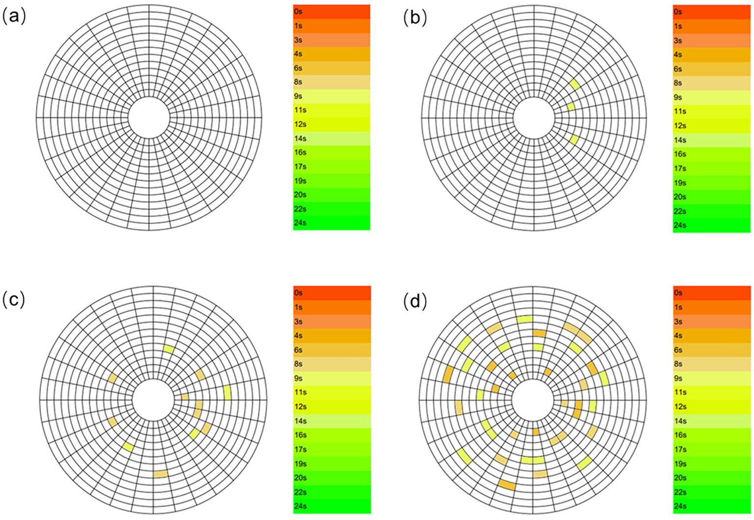 Meibum constitutes an essential component of the tear film and serves to inhibit excessive tear evaporation. A normal TBUT typically exceeds 10 s; values below this threshold indicate tear film instability. Therefore, measurement of TBUT is an important indirect method for evaluating meibomian gland function (2). Figure 7 illustrates schematic representations of TBUT patterns in subjects with different levels of smoking exposure. Non-smoking subjects (Figure 7a) exhibited no tear film break-up within 10 s, indicating a stable tear film. The first break-up time (fBUT) and average break-up time (avBUT) in this group were 10.591 ± 3.699 s and 12.341 ± 3.882 s, respectively. Notably, the large standard deviation suggests variable tear film stability even among non-smokers. Figure 7b presents the TBUT pattern in mild smokers, who displayed relatively few break-up points within 10 s. Their fBUT and avBUT decreased to 9.537 ± 3.828 s and 10.585 ± 3.578 s. With increased smoking exposure, moderate smokers (Figure 7c) revealed more corneal break-up points within 10 s compared to the mild group. Their fBUT and avBUT were further reduced to 8.059 ± 3.756 s and 8.734 ± 3.467 s. Heavy smokers (Figure 7d) demonstrated extensive corneal break-up within 10 s. This group had the shortest break-up times, with an fBUT of 6.448 ± 4.145 s and an avBUT of 7.862 ± 4.077 s.