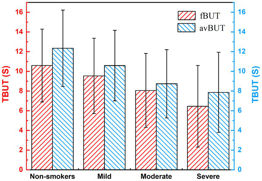 The discrepancies between the findings of this study and previous reports may be attributed to differences in the methodology used for measuring TBUT. Earlier studies commonly employed an invasive approach, which involves instilling sodium fluorescein into the eye and subsequently evaluating it under blue light using a slit-lamp microscope with a yellow enhancement filter (18–21). However, the dye itself may stimulate reflex tearing, thereby disrupting tear film stability and influencing the measurement outcomes (22, 23). In contrast, this study utilized a non-invasive measurement technique based on the principle of Placido disk projection. By analyzing tear film reflection images, this method allows for assessment over a broader corneal area, up to 10 mm in diameter (24). Since this approach avoids chemical interference with the tear film, the obtained non-invasive TBUT values are generally lower than those acquired via the fluorescein method, with reported mean differences of up to 3.7 s (25, 26), this discrepancy decreases as the baseline TBUT value decreases. It is noteworthy that Srivastav et al., also using a non-invasive approach, confirmed a significant correlation between meibomian gland dropout and shorter NIBUT values in a healthy population. This finding aligns with the results of the present study: smoking concurrently leads to more severe meibomian gland dropout and lower NIBUT values, collectively revealing the dual detrimental effects of smoking on both the structure of the meibomian glands and the stability of the tear film (27).