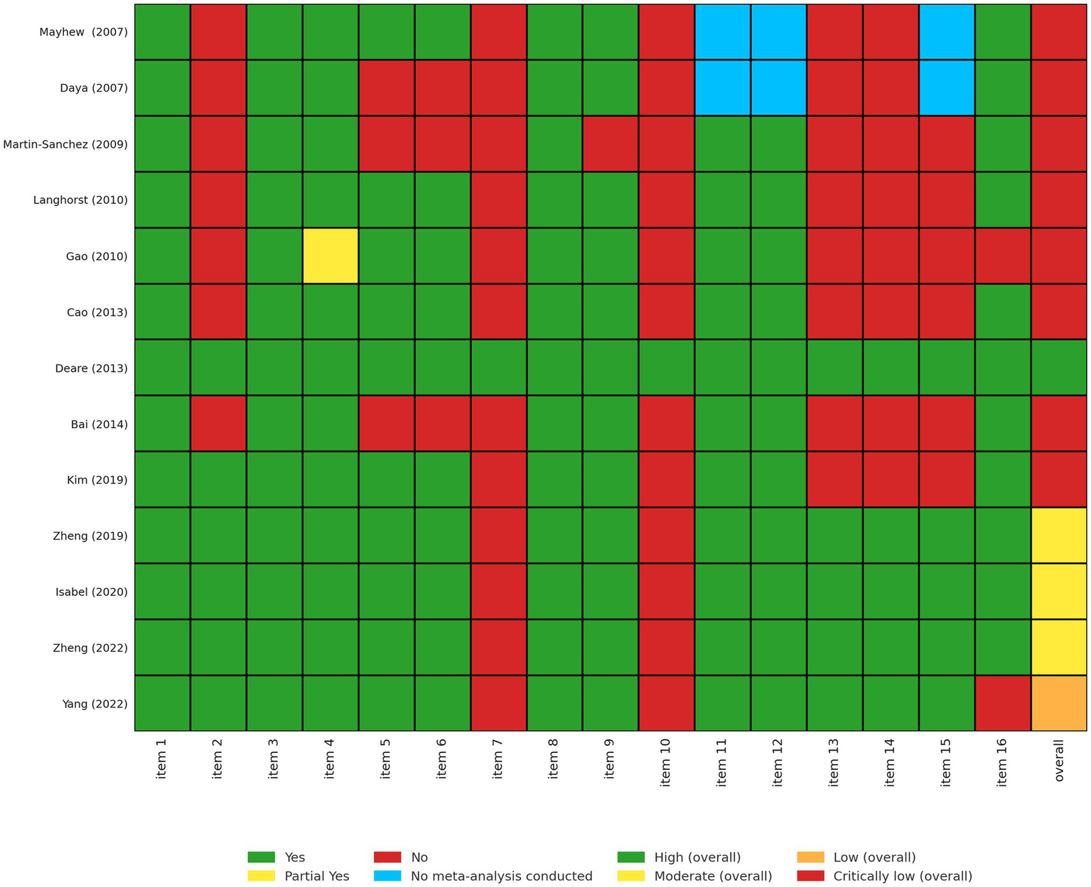 The methodological quality of the SRs and MAs was assessed using the AMSTAR-2 scale (18). This scale contains 16 items that can be answered as “Yes, Partially yes, or No.” If two or more of the key questions (2, 4, 7, 9, 11, 13, 15) are omitted, the quality is considered “Critically low.” If one key item is omitted, the quality is considered “Low.” If two or more of the non-critical items, excluding the important ones mentioned above, are omitted, the quality is considered “Moderate.” Additionally, if important items and one missing or unimportant item are omitted, the quality is rated as “High.”