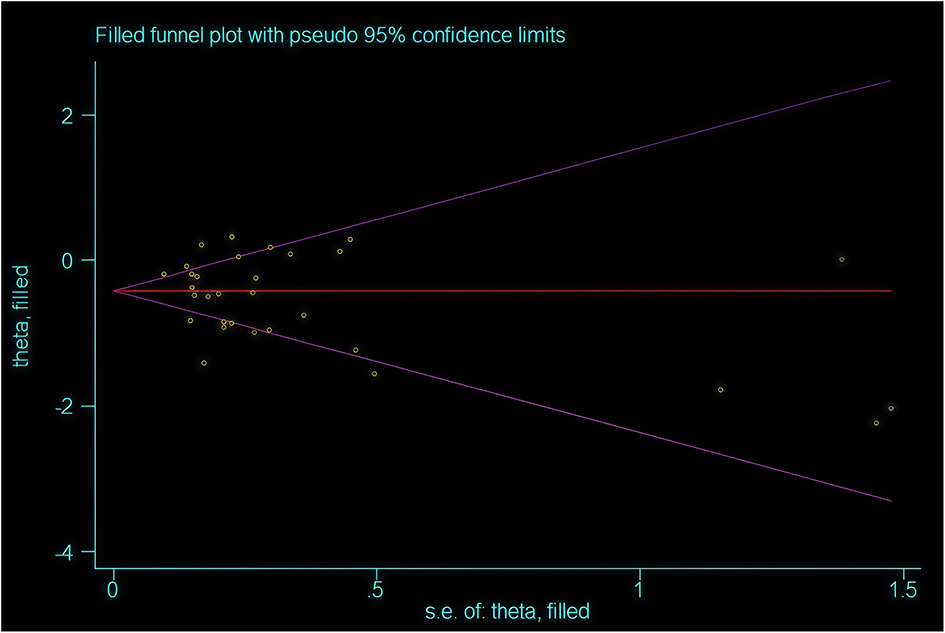 Stata 14.0 statistical software was used. Odds ratios (RR) and their corresponding 95% confidence intervals were used for binary data, and normalized mean differences (SMD) and their corresponding confidence intervals were used for continuous data. The I2 statistic and Cochran's Q-test were used to estimate heterogeneity. Heterogeneity was categorized as none (0%), low (0%−25%), moderate (25%−50%) and high (>50%). The statistical analysis of heterogeneity tests within forest plots follows distributions with a significance level of α = 0.05. Heterogeneity was detected among studies when I2 > 50%. Fixed-effects models were employed for pooled effect size analysis in studies without heterogeneity, while random-effects models were utilized in the presence of heterogeneity. When heterogeneity was high (I2 > 50%), the random-effects model was used because real effect differences were assumed to exist among the included studies. Sensitivity analyses were performed when heterogeneity was present. Subgroup analyses were performed for the primary outcome. Funnel plots were used to detect publication bias. GRADE was used to assess the quality of evidence for each outcome.