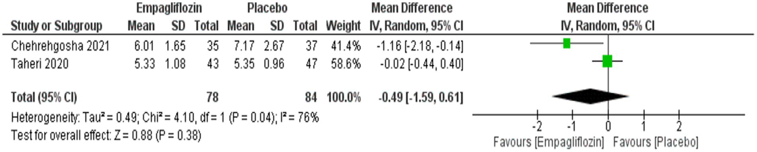 ![Forest plot comparing empagliflozin to placebo in two studies: Chehrehgosha 2021 and Taheri 2020. Mean differences and standard deviations are shown, with total weights of 41.4% and 58.6%, respectively. The overall mean difference is -0.49 with a confidence interval of [-1.59, 0.61]. Heterogeneity is indicated by Tau squared equals 0.49, Chi squared equals 4.10, and I squared equals 76%. The overall effect Z equals 0.88 with a P-value of 0.38.](https://www.frontiersin.org/files/Articles/1712586/xml-images/fmed-12-1712586-g006.webp)