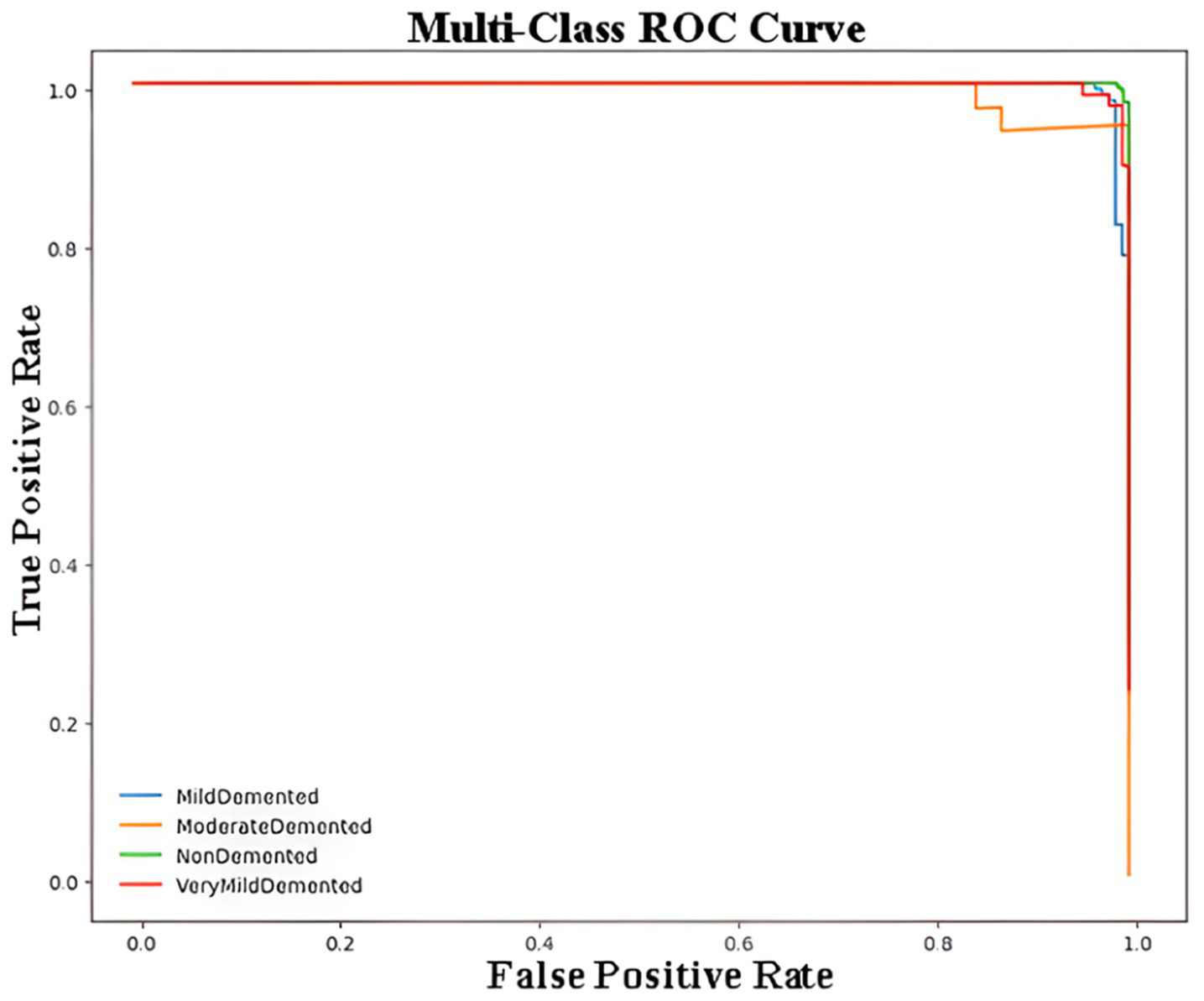 Figure 5 represents the Receiver Operating Characteristic (ROC) curve for a multi-class classification problem in the context of Alzheimer’s disease detection using a CNN model. The ROC curve plots the True Positive Rate (Sensitivity) against the False Positive Rate (1 – Specificity) for each class, providing a visualization of the model’s performance for distinguishing between the four classes of Alzheimer’s disease. Each curve demonstrates how the sensitivity and specificity trade-off changes at different classification thresholds. The closer the curve is to the top-left corner of the plot, the better the model’s performance. The overlapping or closely aligned curves suggest high classification accuracy across all classes, as reflected by the minimal gaps between the curves. The macro-AUC and micro-AUC scores were calculated as 0.987 and 0.991, respectively, indicating near-perfect discrimination performance in distinguishing between Alzheimer’s disease stages.