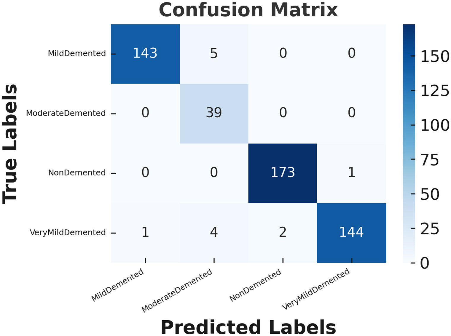 Figure 6 demonstrates the confusion matrix for the CNN model used to classify Alzheimer’s disease stages. The confusion matrix provides a detailed view of the model’s predictions compared to the actual labels, highlighting both correct and incorrect classifications. Each row corresponds to the true class labels, while each column represents the predicted class labels. For the “Mild dementia” class, the model correctly classifies 143 out of 148 samples, with only 5 samples being misclassified as “Moderate Person with dementia.” Notably, none of the “Mild dementia” samples were misclassified as “Non-dementia” or “Very Mild dementia.” The “Moderate Person with dementia” class demonstrates perfect performance, as all 39 samples are correctly classified, with no misclassifications observed. Similarly, for the “Non-dementia” class, the model achieves near-perfect results, correctly classifying 173 out of 174 samples, with only one sample misclassified as “Very Mild dementia.” The “Very Mild dementia” class also shows strong performance, with 144 out of 151 samples correctly classified. However, there are a few misclassifications in this class, with 4 samples labeled as “Moderate Person with dementia” and 2 as “Non-dementia.”
