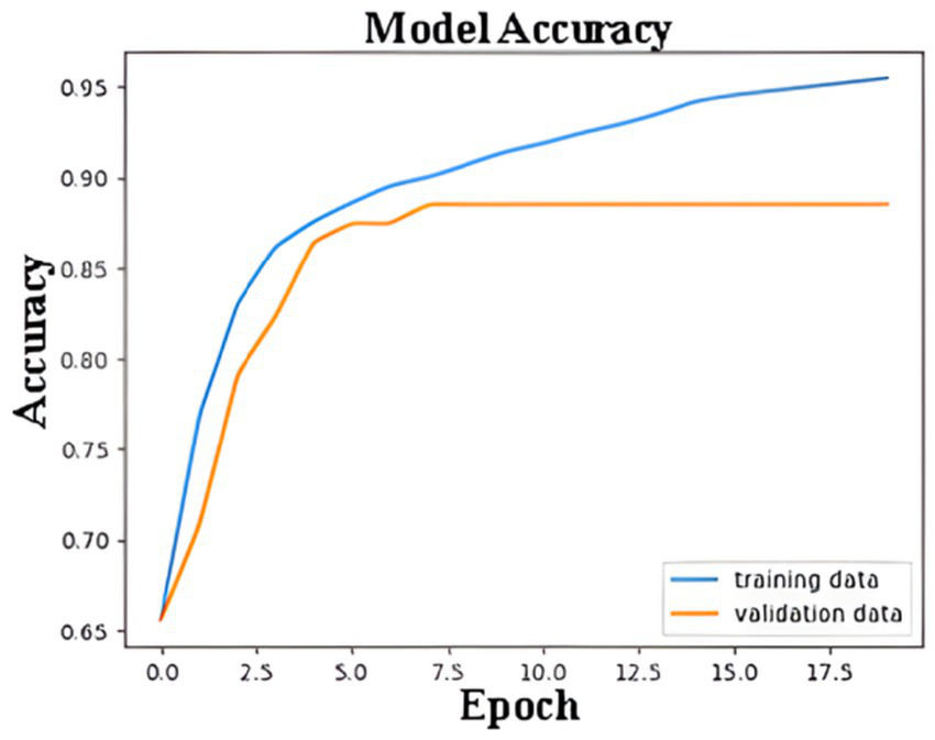 Figure 9 shows the ANN model’s accuracy during the training and validation processes over 18 epochs. The blue line represents the accuracy achieved on the training dataset, while the orange line reflects the accuracy on the validation dataset. Initially, the accuracy for both the training and validation datasets increases rapidly, indicating that the model is learning to distinguish features effectively. By around the 5th epoch, the validation accuracy starts to stabilize, reaching a plateau at approximately 85%. The training accuracy, on the other hand, continues to improve and eventually surpasses 95%. The gap between the training and validation accuracy after the 5th epoch indicates a slight overfitting, where the model performs better on the training data than on unseen validation data. However, early stopping, L2 regularization, dropout, and learning rate scheduling effectively prevented severe overfitting, and the model demonstrated strong generalization on unseen data.