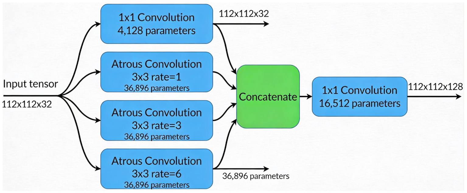 Figure 2. ASPP module architecture illustrating multiscale context aggregation using four parallel branches (one 1 × 1 convolution and three 3 × 3 atrous convolutions with dilation rates 1, 3, and 6), followed by concatenation and a 1 × 1 convolution to fuse features into a 112 × 112 × 128 output tensor.