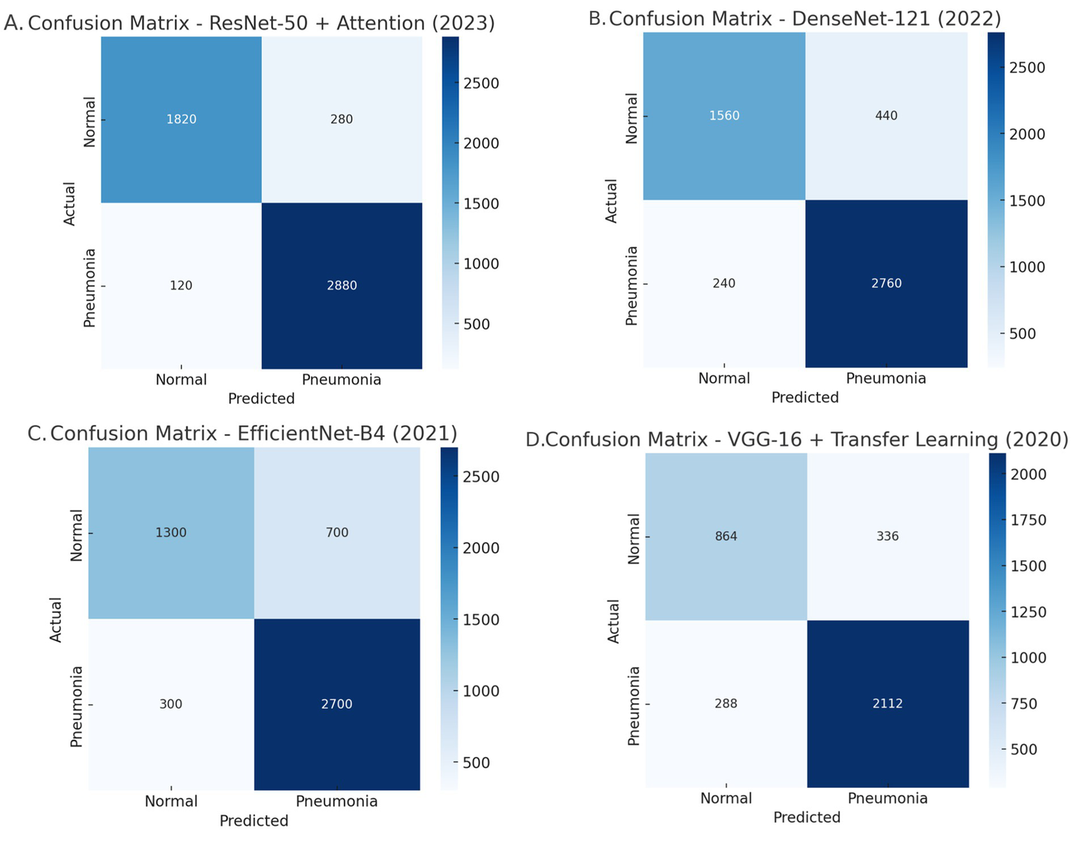 Figure 6. Comparative analysis of the confusion matrices: (A) Resnet-50 + Attention, (B) DenseNet-121, (C) EfficientNet-B4, and (D) VGG-16 + Transfer learning.