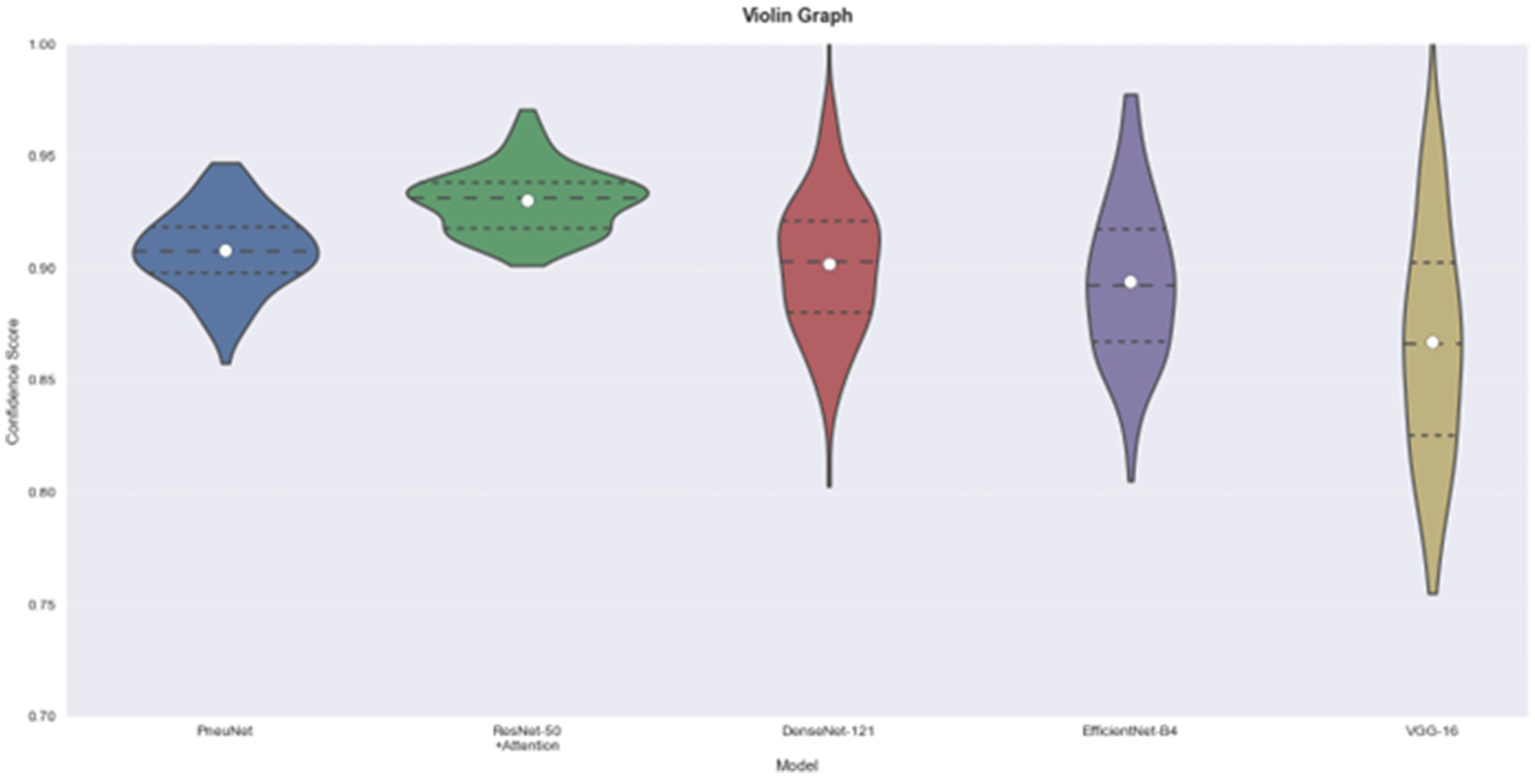 Figure 10. Model comparison using violin graph. On the left is our model, PneuNet, followed by ResNet-50, DenseNet-121, EfficientNet-B4, VGG-16.