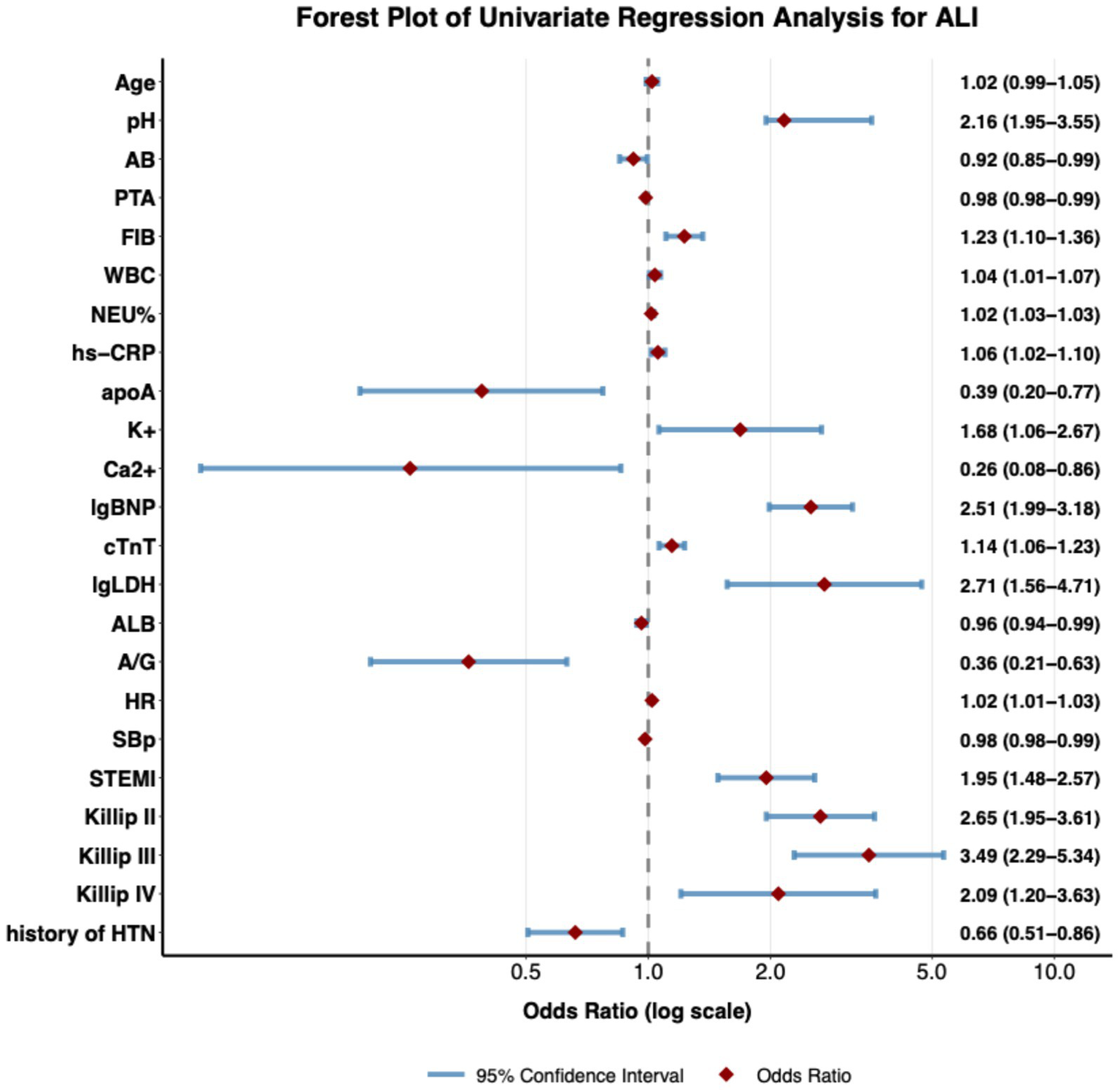Table 3 presents the comprehensive laboratory and biomarker analyses, demonstrating significant differences between patients with mechanical complications and those without (Table 3). The complication group exhibited pronounced activation of inflammatory pathways, evidenced by significantly higher white blood cell count (WBC: 8.80 ± 4.07 vs. 8.21 ± 3.61 × 109/L, p = 0.019), neutrophil percentage (NEU%: 76.86 ± 10.00 vs. 75.16 ± 10.48, p = 0.016), and high-sensitivity C-reactive protein (hs-CRP: 5.94 ± 3.63 vs. 5.23 ± 3.59 mg/L, p = 0.006). Markers of myocardial injury and stress were substantially elevated: cardiac troponin T (cTnT median: 0.41 vs. 0.29 ng/mL, p < 0.001) and N-terminal pro-B-type natriuretic peptide (NT-proBNP median: 3992.00 vs. 1308.00 pg/mL, p < 0.001) were significantly higher in the complication group. A prothrombotic state was indicated by elevated fibrinogen (FIB: 4.12 ± 1.28 vs. 3.79 ± 1.21 g/L, p < 0.001) and D-dimer (median: 1.08 vs. 0.76 mg/L, p = 0.046). Notable metabolic derangements included lower serum calcium (2.15 ± 0.15 vs. 2.20 ± 0.17 mmol/L, p = 0.026), higher potassium (4.15 ± 0.51 vs. 4.01 ± 0.49 mmol/L, p = 0.028), reduced albumin (ALB: 35.83 ± 5.91 vs. 36.80 ± 5.03 g/L, p = 0.005), and lower LDL-C (2.04 ± 0.88 vs. 2.16 ± 0.84 mmol/L, p < 0.001). Arterial blood gas analysis revealed lower PCO₂ (33.39 ± 6.65 vs. 36.63 ± 5.39 mmHg, p < 0.001) and higher pH (7.42 ± 0.06 vs. 7.40 ± 0.05, p = 0.011) in the complication group. Lipoprotein(a) was also elevated (344.94 ± 268.16 vs. 313.07 ± 272.70 g/L, p = 0.018).