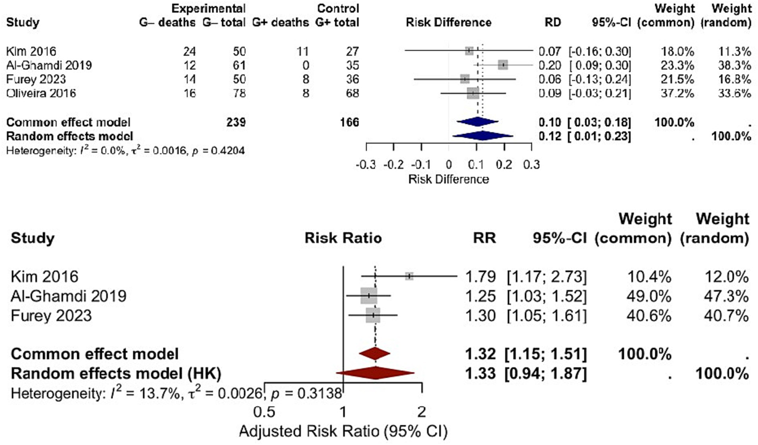 Figure 5. Side-by-side forest plot comparing (Upper panel) crude RD and (Lower panel) adjusted mortality RR between Gram-negative and Gram-positive bacterial infections using the HKSJ random-effects model.