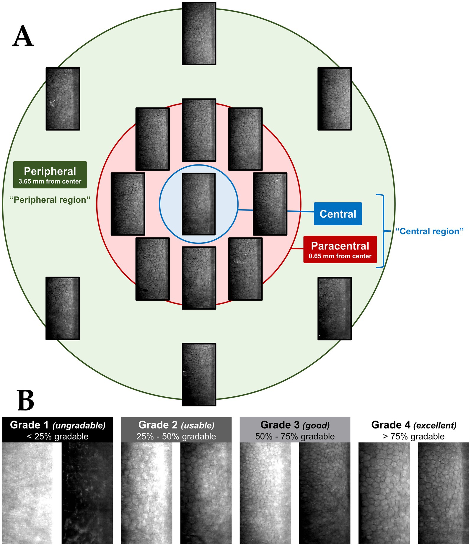 Figure 1. (A) Example of a widefield specular microscopy (WFSM) scan from the Nidek CEM-530. The different locations are depicted as: blue for central, red for paracentral and green for peripheral. Each scan consists of 1 central, 8 paracentral and 6 peripheral images of the corneal endothelium. The central and paracentral images comprise the central region within a 1.3 mm diameter. The peripheral region is an outer annulus that is 7.3 mm in diameter. (B) Examples of specular images with various quality grades (1–4). Grade 1 images (ungradable) had less than 25% of the total area being gradable. Grade 2 images (usable) had 25%–50%, grade 3 images (good) had 50%–75% and grade 4 images (excellent) had more than 75% of the total area being gradable. This grading scheme was adapted from Huang et al. (29).