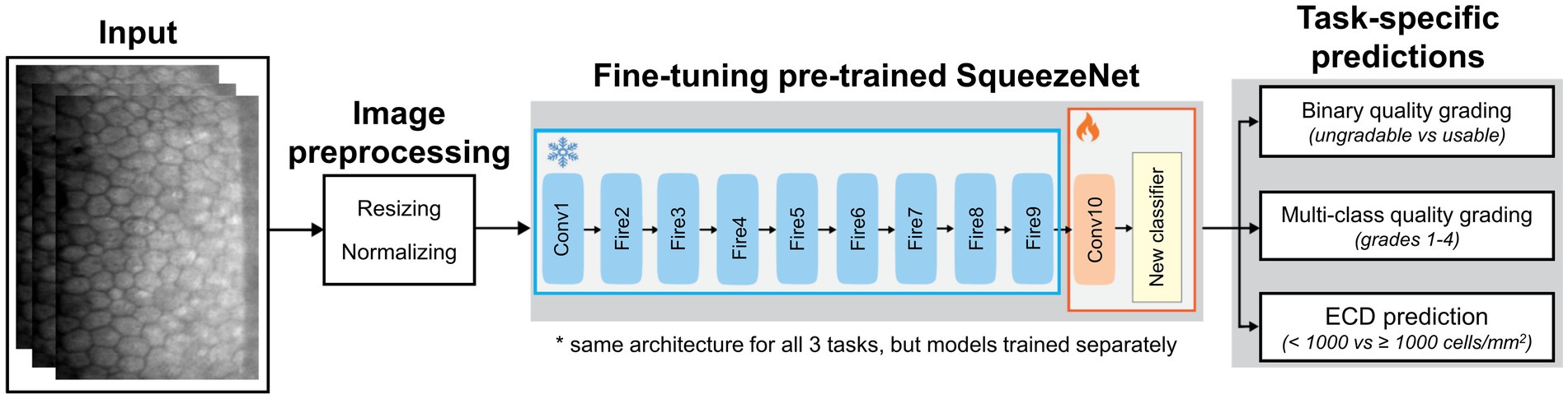 Figure 2. Deep learning pipeline for automated image quality grading and ECD prediction using a fine-tuned SqueezeNet1. The early layers are frozen to retain ImageNet-learned features, while only the final convolutional and classifier layers are fine-tuned using specular microscopy images. The same architecture is used across the three tasks.