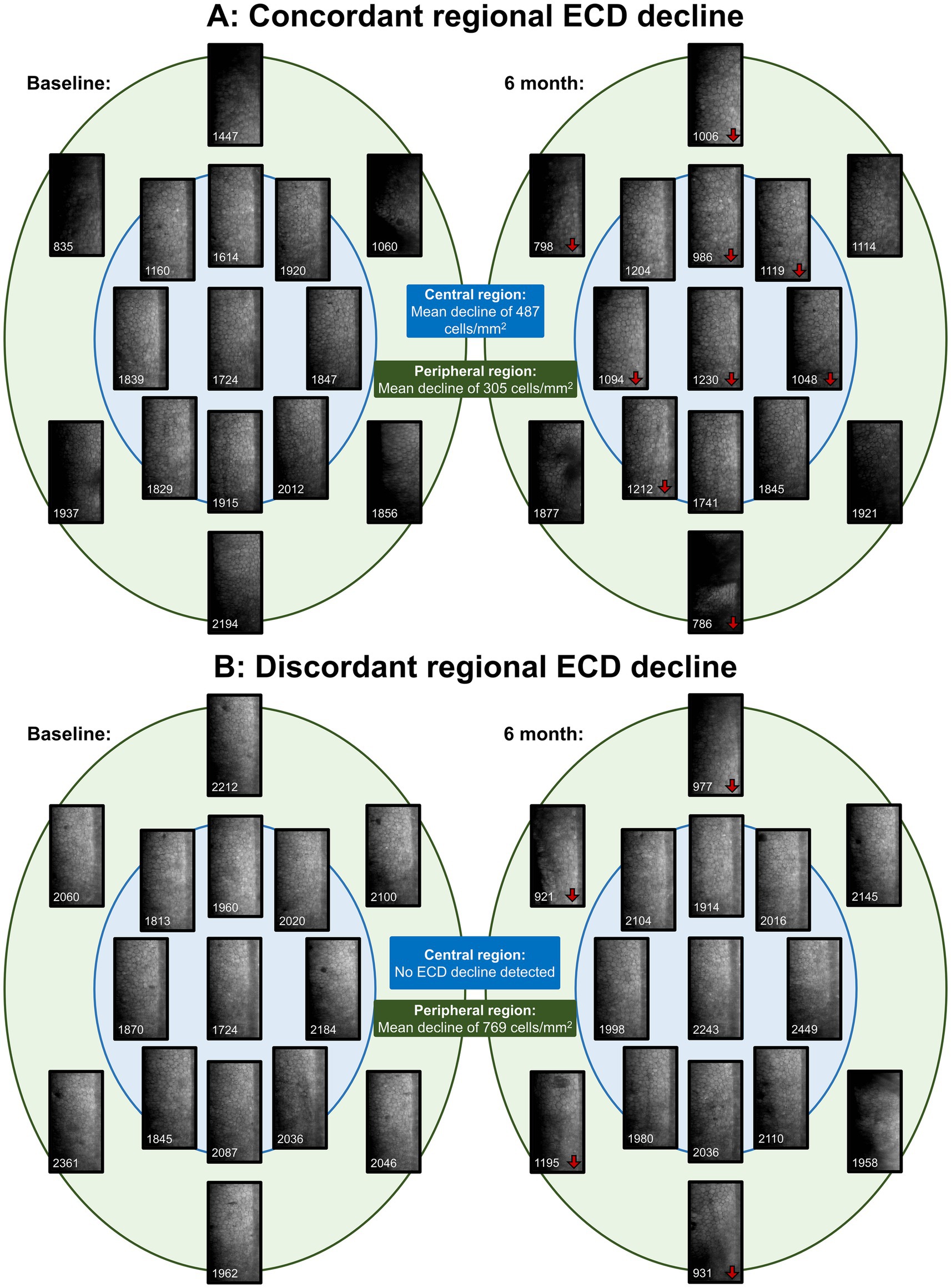 Figure 3. Widefield specular microscopy (WFSM) images at baseline visit and 6-month visit, highlighting endothelial cell decline (ECD) regionally. ECD for each image are marked at the bottom of the image in white, and areas that had > 10% decline in ECD were marked with red arrows next to the ECD values. (A) demonstrates concordant regional declines between the central and peripheral regions. This patent is a Chinese male who had DMEK at age 57 for FECD. (B) demonstrates discordant regional declines between the central and peripheral regions. This patent is a Chinese female who had DMEK at age 66 for FECD.