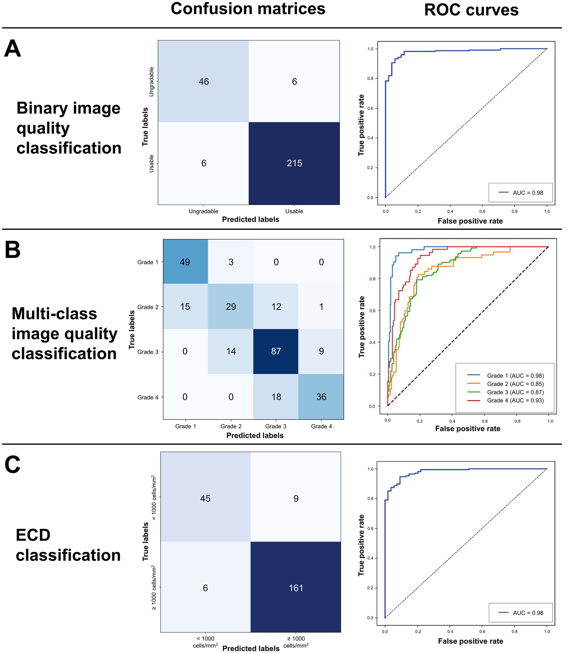 Figure 4. Confusion matrices and receiver operating characteristic (ROC) curves assessing the three tasks of the deep learning model for (A) binary image quality classification, (B) multi-class image quality classification and (C) ECD classification. Average AUCs for the tasks are 0.979, 0.907 and 0.980 respectively.
