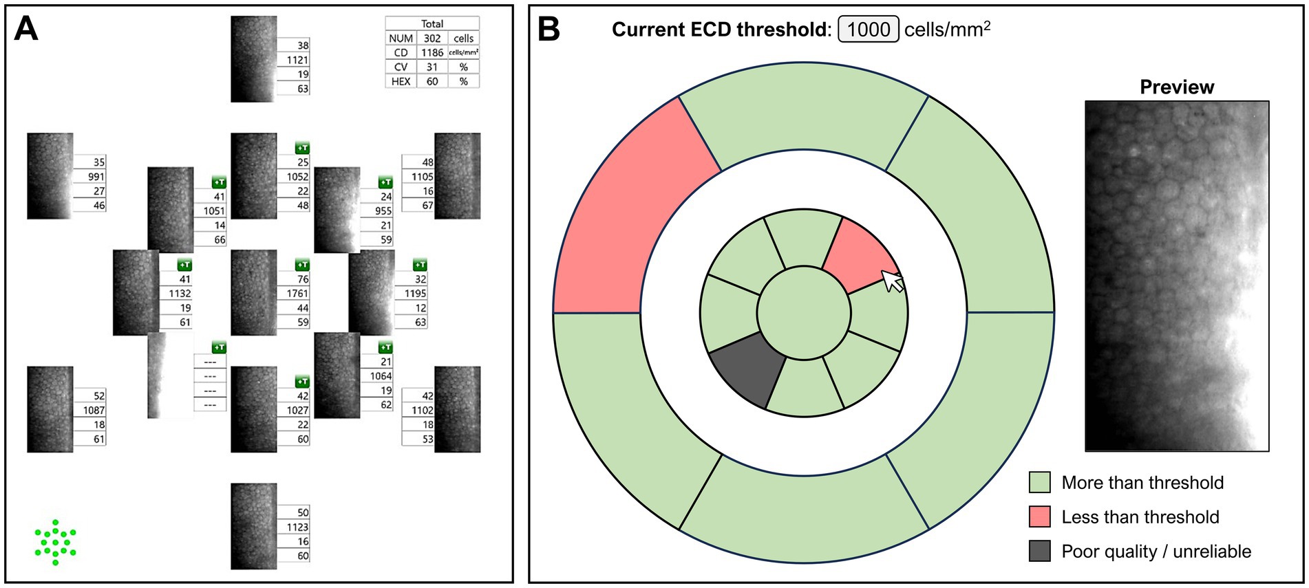 Figure 6. (A) User interface currently for Nidek WFSM scans. (B) Example of user interface with deep learning assisted image quality and ECD classification. The threshold can be preset by the user, and hovering the cursor over any of the areas shows a preview of that specular image.