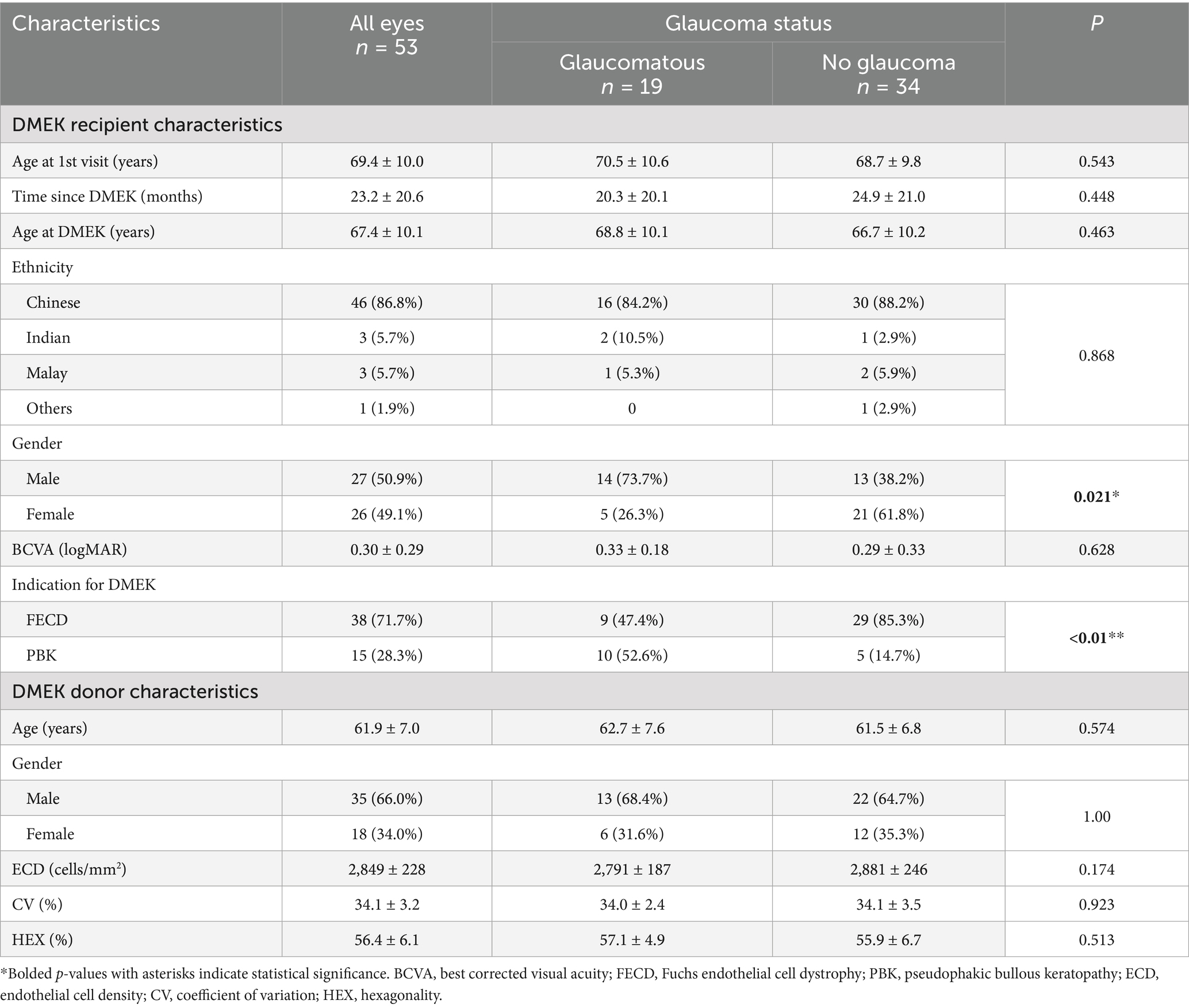 We included 53 eyes with surviving DMEK grafts (43 subjects) at least 1 year after surgery (mean 23.2 ± 20.6 months) that demonstrated clinically stable cornea clarity and stable ECD. Demographics and clinical summary are detailed in Table 1. Mean age of our subjects (at the time of DMEK) was 67.4 ± 10.1 years, 71.7% of the eyes had DMEK for cornea decompensation due to FECD (n = 38) and 28.3% for PBK (n = 15). Of the 53 eyes, 35.8% had pre-existing glaucoma (n = 19) and 64.2% did not have glaucoma (n = 34).