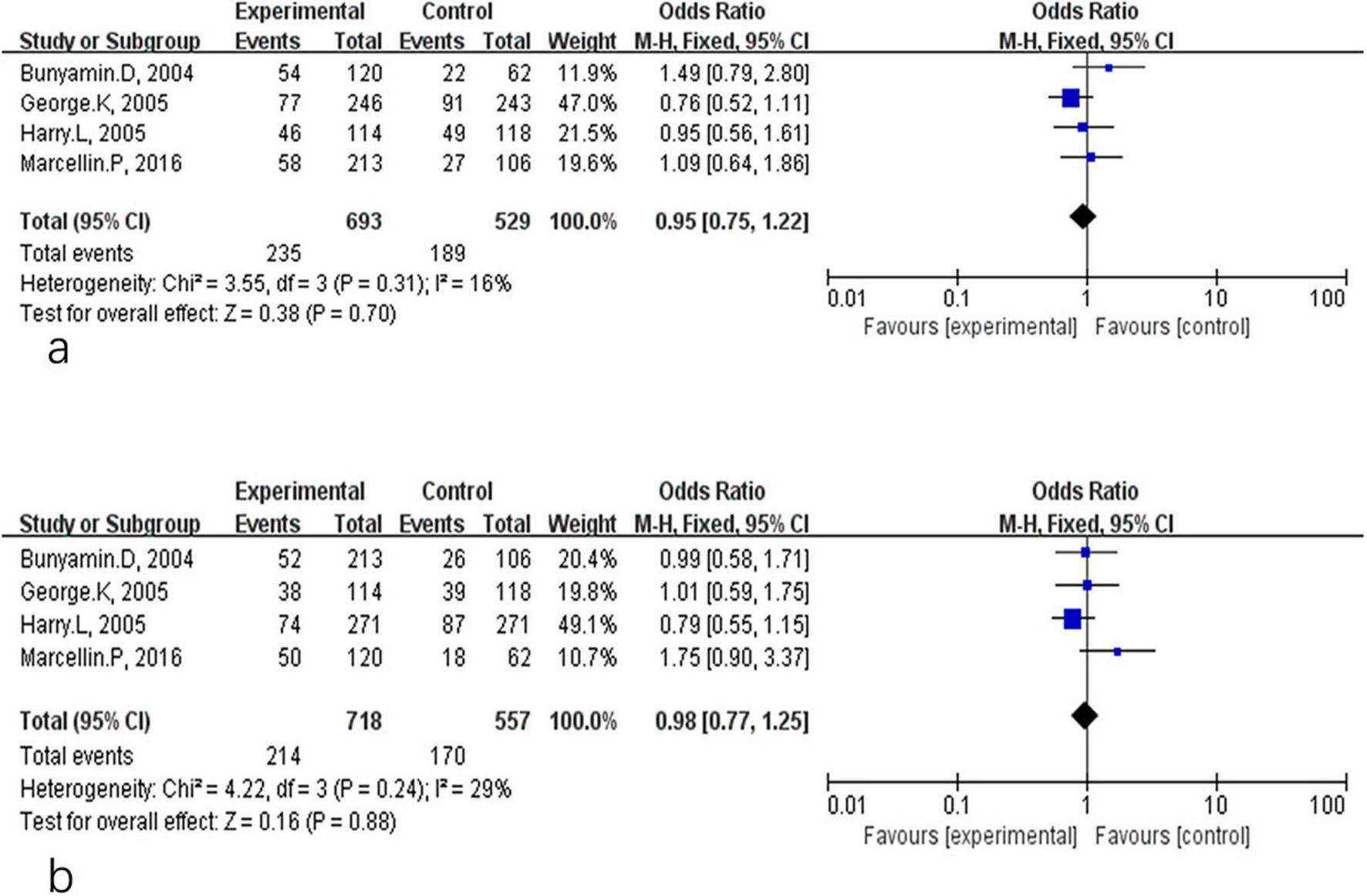 ![Two forest plots showing meta-analysis results. Panel (a) indicates odds ratios for eight studies comparing experimental and control groups. The overall effect favors the experimental group with an odds ratio of 5.79, confidence interval [3.08, 10.90], and significant heterogeneity (I-squared = 88%). Panel (b) also presents odds ratios for eight studies with a slightly lower overall effect favoring the experimental group, odds ratio 1.99, confidence interval [0.95, 4.18], and heterogeneity at 84%. Blue squares and lines represent study-specific odds ratios and confidence intervals.](https://www.frontiersin.org/files/Articles/1716225/xml-images/fmed-12-1716225-g006.webp)