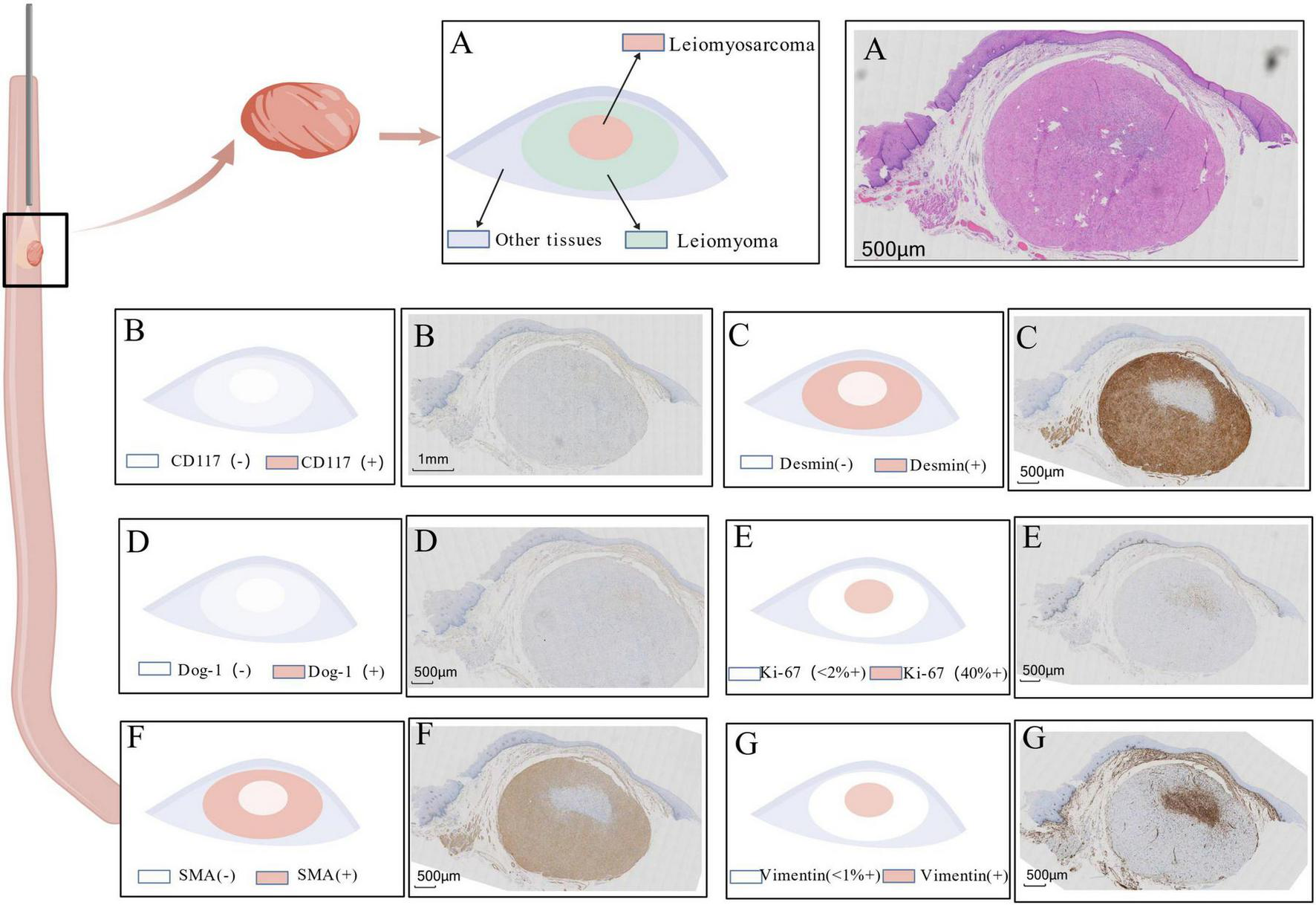Histopathological and immunohistochemical characteristics of the resected tumor. (A) Hematoxylin and Eosin (H&E) stain: Overview demonstrating a transition zone (dashed line) between the peripheral leiomyoma-like area (left), composed of spindle cells arranged in orderly fascicles, and the central sarcomatous area (right),whch exhibits hypercellularity, marked nuclear atypia, and increased mitotic activity (inset, arrow indicates a mitotic figure). (B–G) Immunohistochemical staining results: (B) CD117: Negative in both tumor components, ruling out GIST. (C) Desmin: Strongly positive in the peripheral leiomyoma area (left) and completely negative in the central sarcomatous area (right). (D) DOG-1: Negative throughout the lesion, further supporting the exclusion of GIST. (E) Ki-67: Low proliferation index (<2%) in the leiomyoma area (left), contrasting with a high proliferative index (approximately 40%) in the sarcomatous focus area (right). (F) SMA (Smooth Muscle Actin): Strongly positive in the leiomyoma area (left) and markedly decreased/absent in the sarcomatous area (right), indicating loss of smooth muscle differentiation. (G) Vimentin: Diffusely positive in the sarcomatous area (right), consistent with a malignant mesenchymal phenotype; weak or focal positivity may be observed in the leiomyoma area.