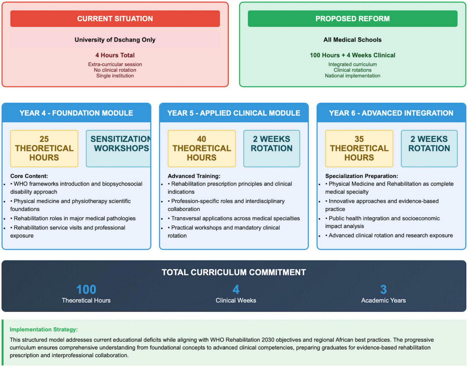 Systematic assessment of medical education across Central Africa reveals that major medical schools—from the Universities of Yaoundé and Douala to Garoua—largely exclude rehabilitation from their core curricula (4, 7). The University of Dschang, ranked first in the CEMAC zone, represents a notable exception, offering minimal 4-h annual rehabilitation exposure (7). Even this limited exposure has demonstrated measurable impact on student career interests, suggesting the magnitude of opportunity lost through systematic educational exclusion.