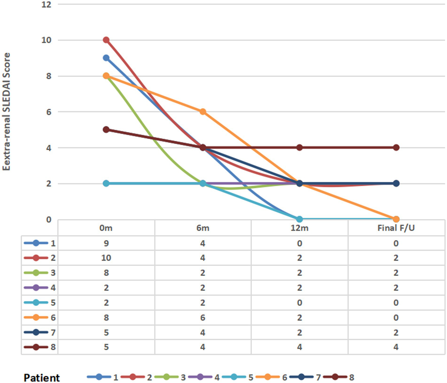 Longitudinal changes in the extra-renal SLEDAI score following belimumab therapy. m, month(s); final F/U, final follow-up visit.