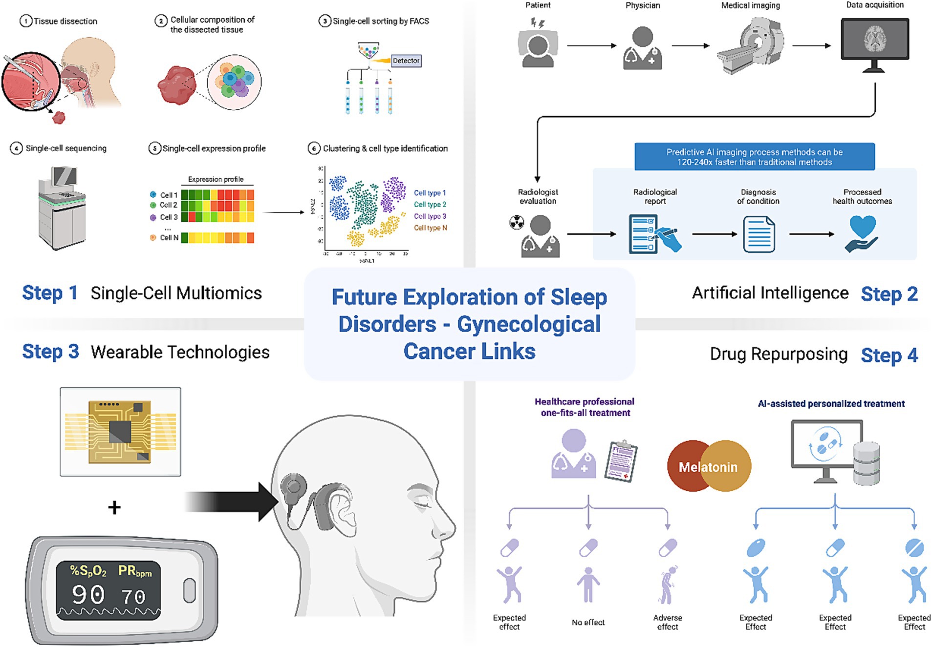Figure 3. Future exploration of sleep disorders-gynecological cancer links. Step 1: Single-cell multiomics unravels dynamic tumor ecosystem complexities. Step 2: AI assists PSG scoring. Step 3: Wearable technologies monitor real-time SpO2 and activity data. Step 4: Repurposing melatonin agonists may offer safer circadian restoration and chemo-sensitization. Created with Biorender.com.